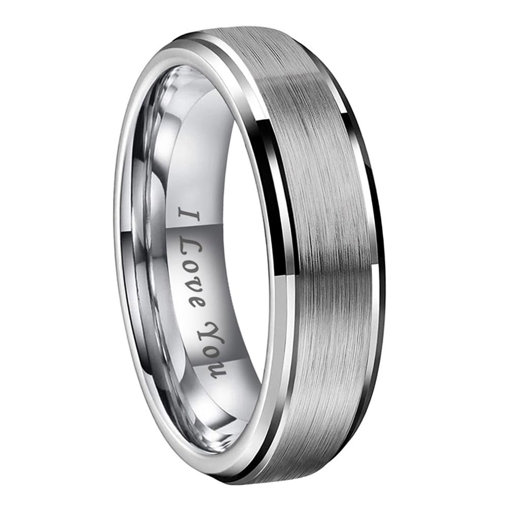 6mm 8mm Silver, Black, Gunmetal, Gold and Rose Gold Tungsten Carbide Rings for Men Women Engagement Wedding Bands Fashion Jewelry Brushed Finish Stepped Beveled Edges I Love You Engraved Comfort Fit. Made of Genuine Tungsten Carbide. Scratch Resistant, Water Proof, Never Tarnish, Nice Weight, Cobalt