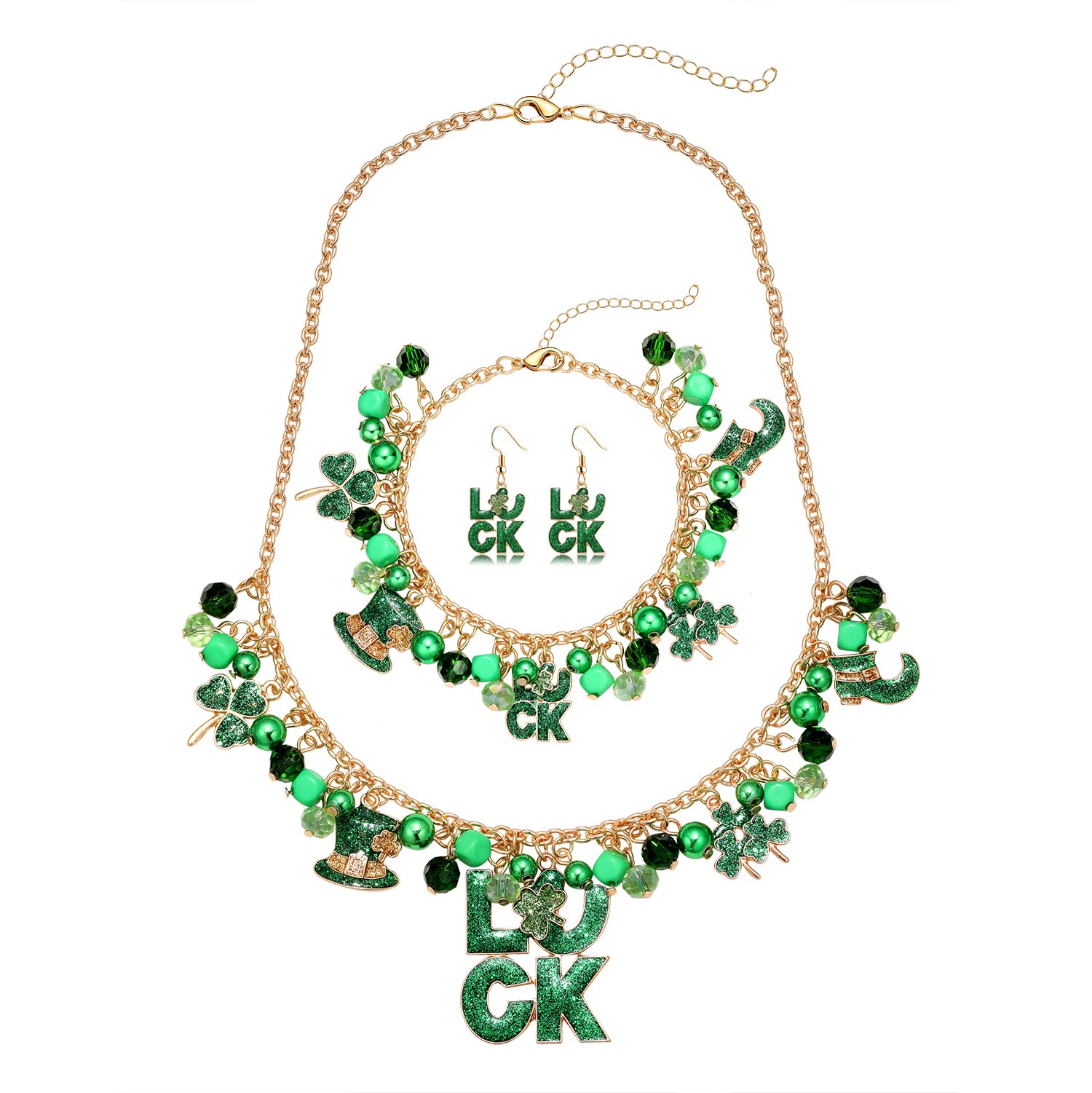 Proudly display your Irish heritage with these sparky St.Patrick's day necklace bracelet and earrings set.consist of green beads with enamel charms and gold chains,charms included a LUCK letter,Leprechaun boot,hat and green clover.Make everyone green with envy with your special luck of the Irish St.