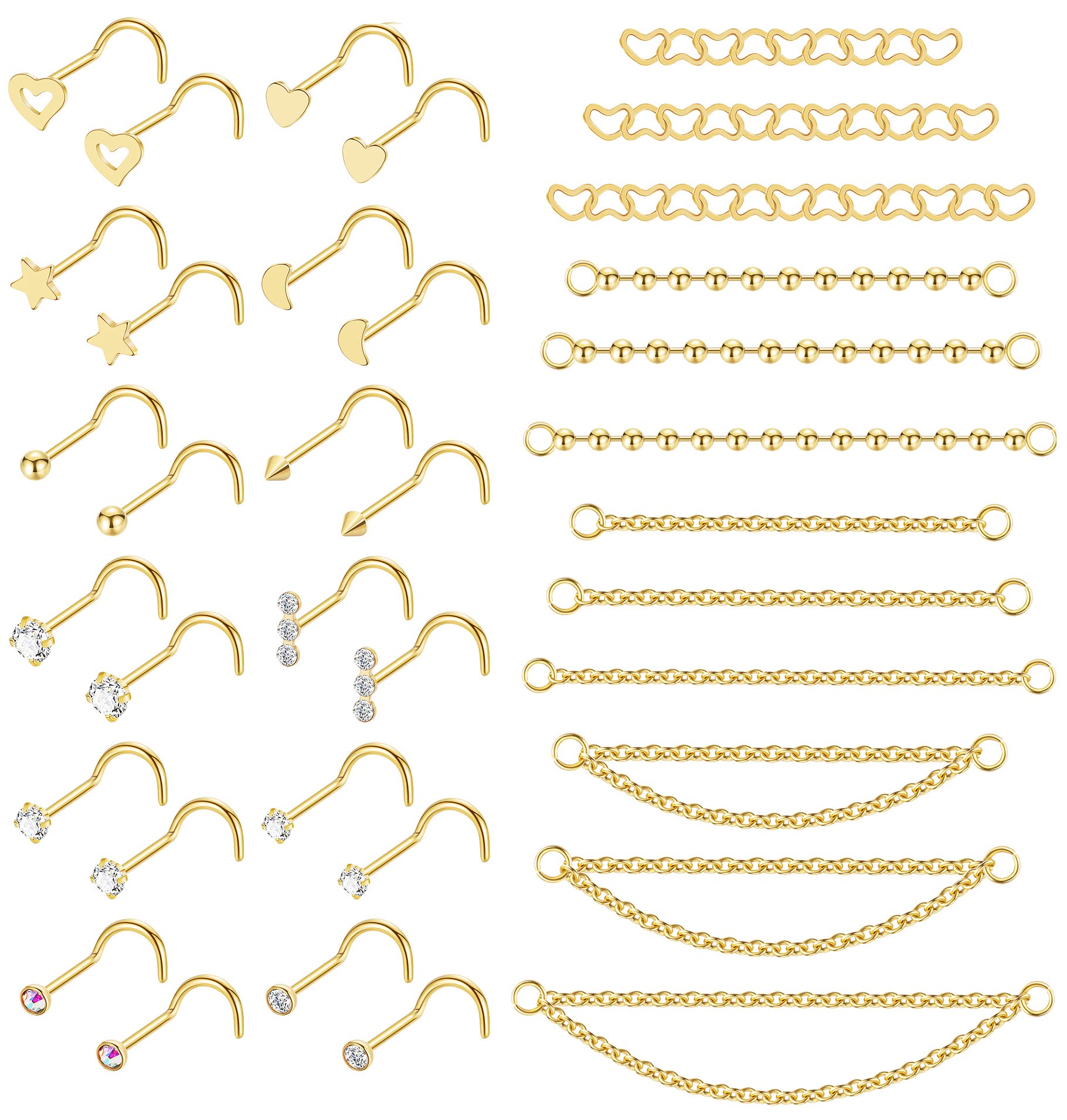 Great Quality: Made from high-quality 316L stainless steel, this nose stud chain piercing set is both durable and hypoallergenic, making it perfect for those with sensitive skin Great Value Set: Come with 12 Pairs 20G 7mm in length nose studs and 12pcs nose chain which in 4 styles, featuring two nos