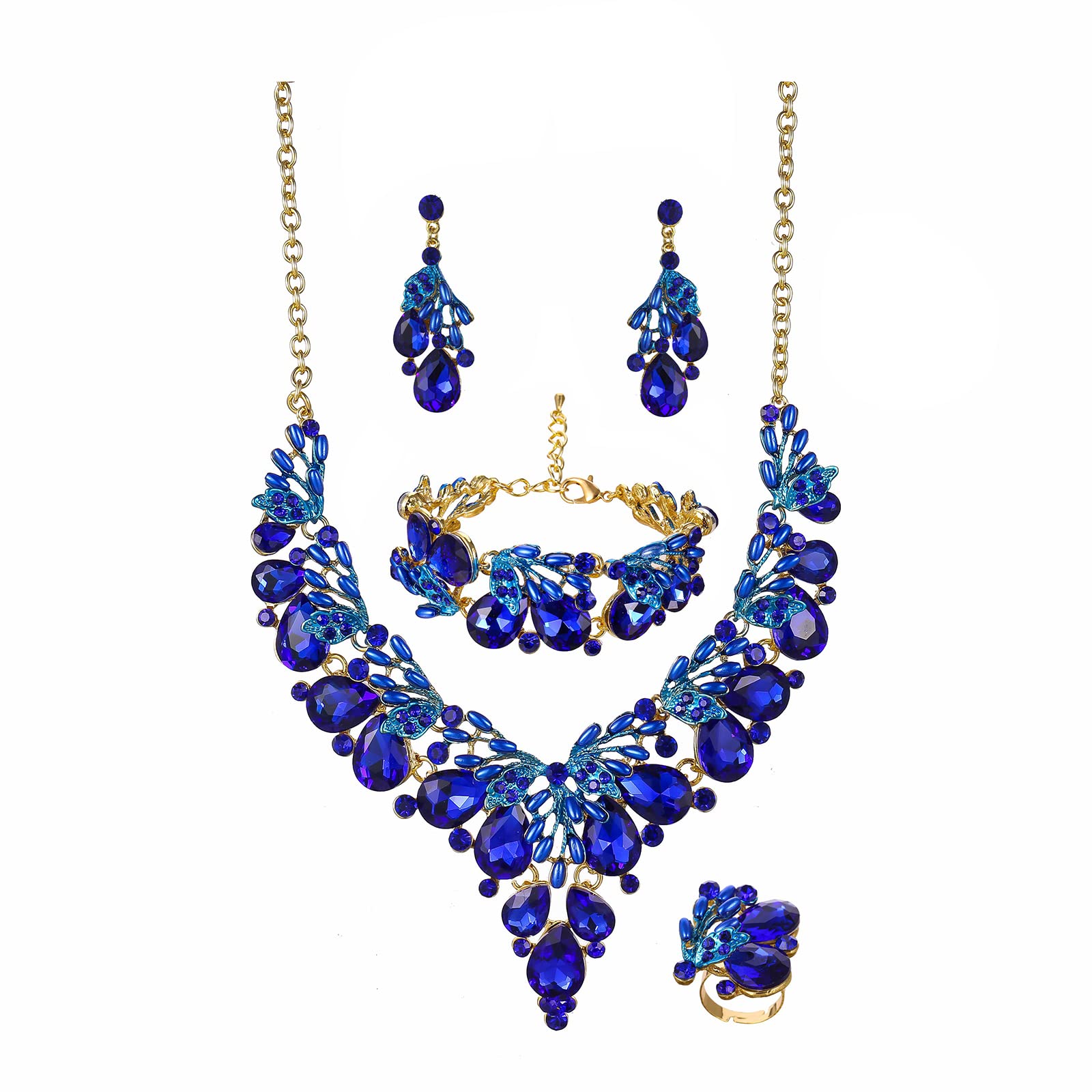 Wedding Jewelry Set for Bride: Sapphire-blue color crystal necklace and earrings set inlaid with hand-selected clear shiny crystal, crafted with hight-quality cooper and crystal, No-Lead & No-Nickel. Crystal Bridal Jewelry Set for Wedding: The statement choker necklace has a chain length of about 16