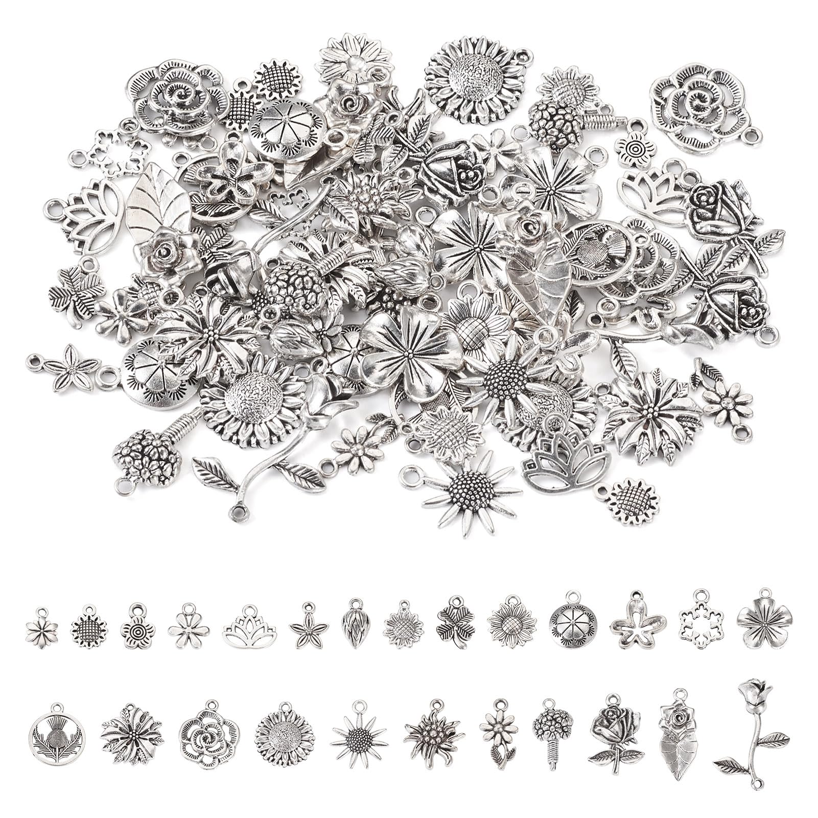 Pandahall 100Pcs Tibetan Alloy Vintage Flower Pendants Sunflower Charms Rose Flower Lotus Thistle Antique Silver Charms 25 Styles for DIY Necklace
