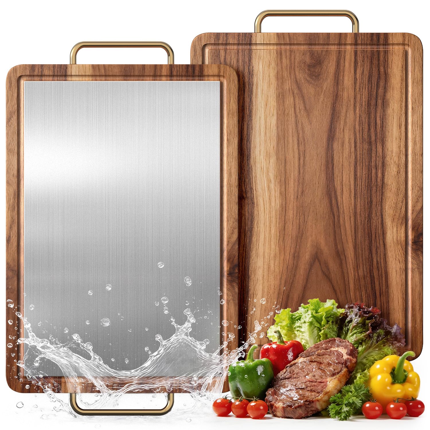 Titanium Cutting Boards for Kitchen, Reversible Acacia Wood Cutting Board, Metal Cutting Boards with Juice Groove and Handle, Versatile Board for Meat