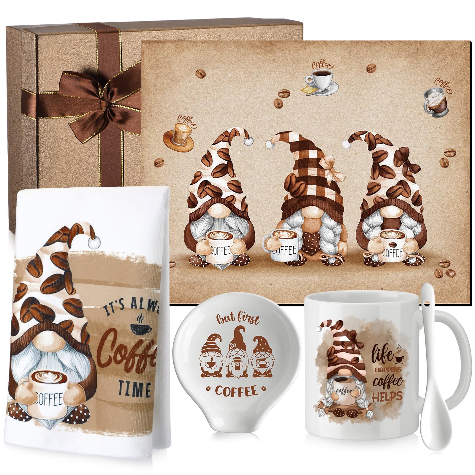 Gnomes Coffee Gift Set: contains 1 coffee bar drying mat, 1 coffee gnome towel, 1 coffee cup, 1 coffee gnome spoon holder and 1 spoon, all items and the included 1 pack of raffia are placed in a brown gift box Coffee Gnome Design: these coffee gifts for women combine coffee and cute gnome design to