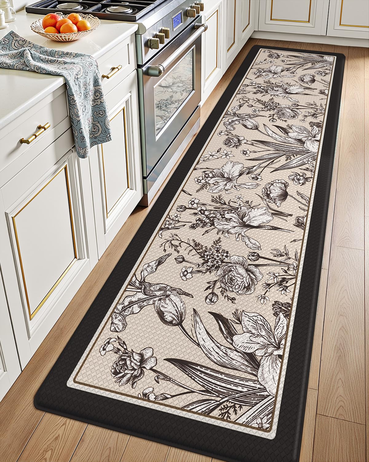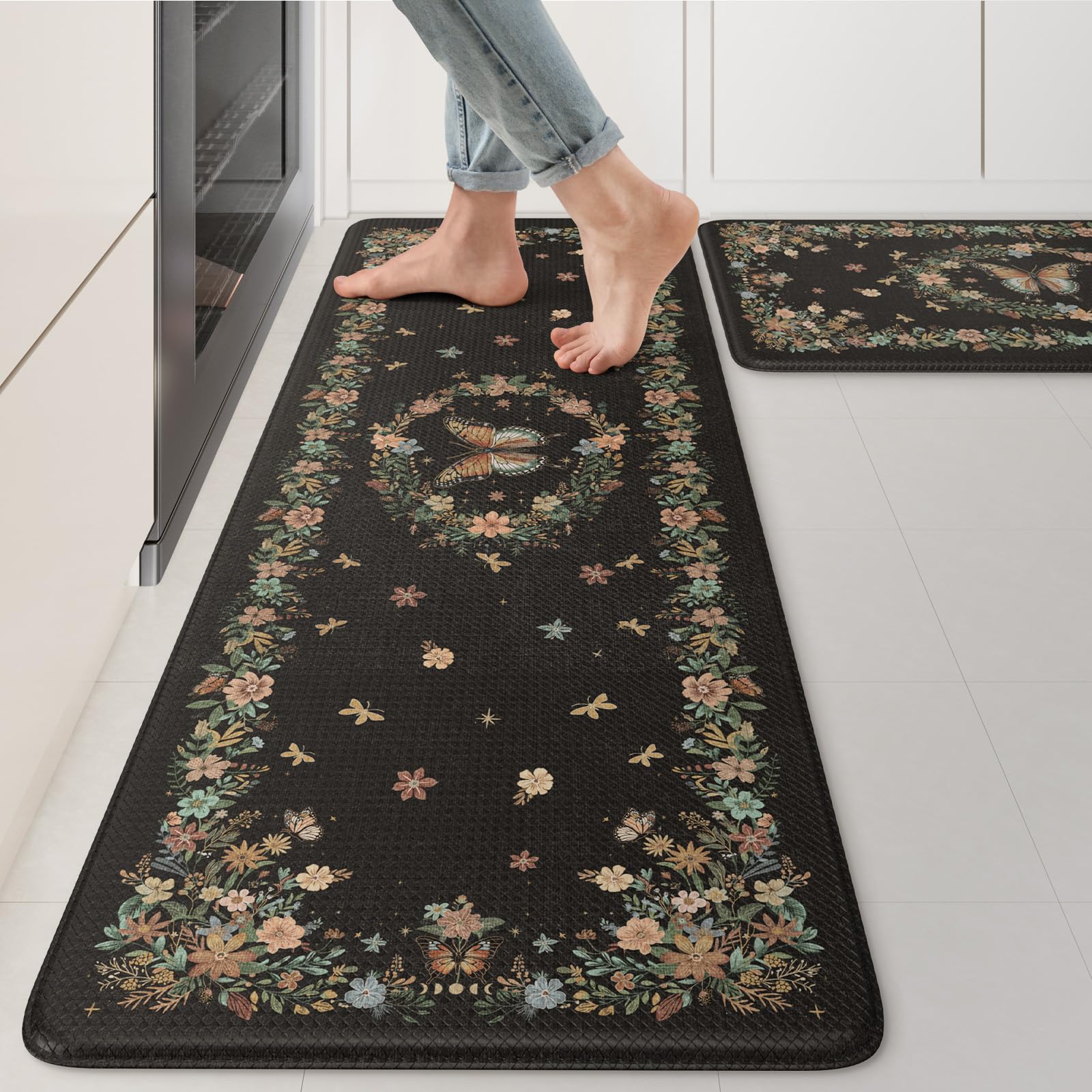 KIMODE Anti Fatigue Mats for Kitchen Floor 17"x47"+17"x29", Butterfly Floral Kitchen Rugs Sets of 2, Cushioned Kitchen Floor Mats, Non Slip Standing