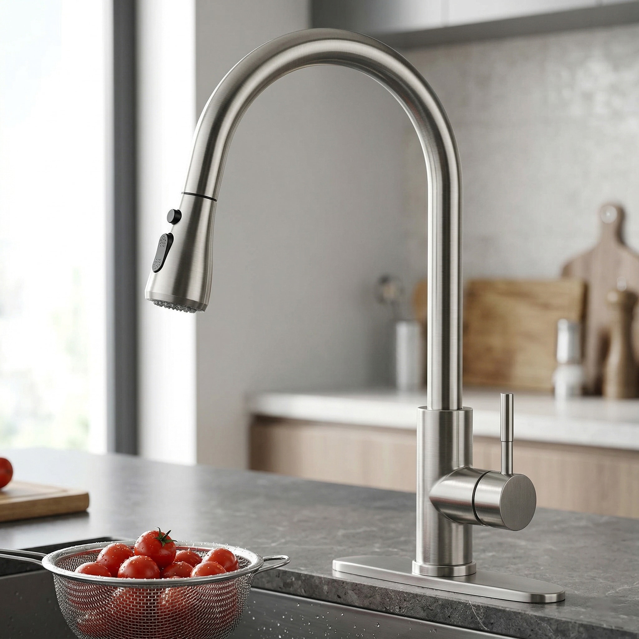 Transform your kitchen into a modern oasis of functionality and style with our Stainless Steel Modern Single-Handle Pull-Down Sprayer Kitchen Faucet. This faucet is the epitome of contemporary design, seamlessly integrating into any kitchen aesthetic.