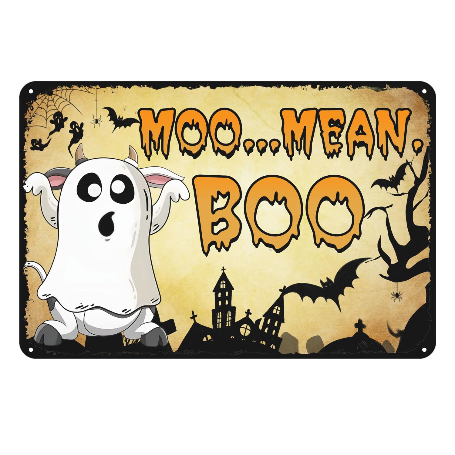 Cows Ghost Halloween Tin Sign Moo I Mean Boo Cow Garage Home Porch Yard Lawn Outdoor Funny Halloween Decor Metal Sign 12x8Inch