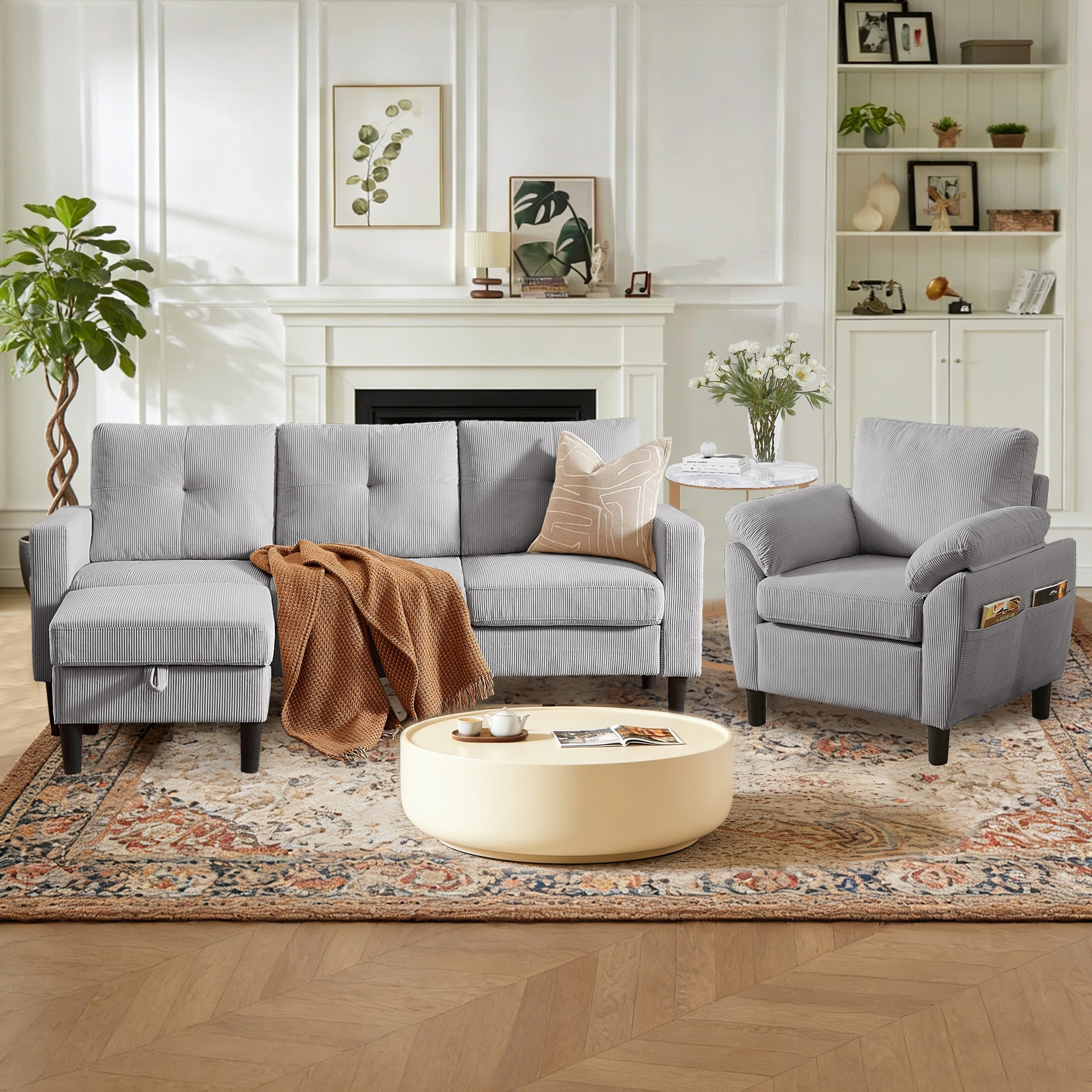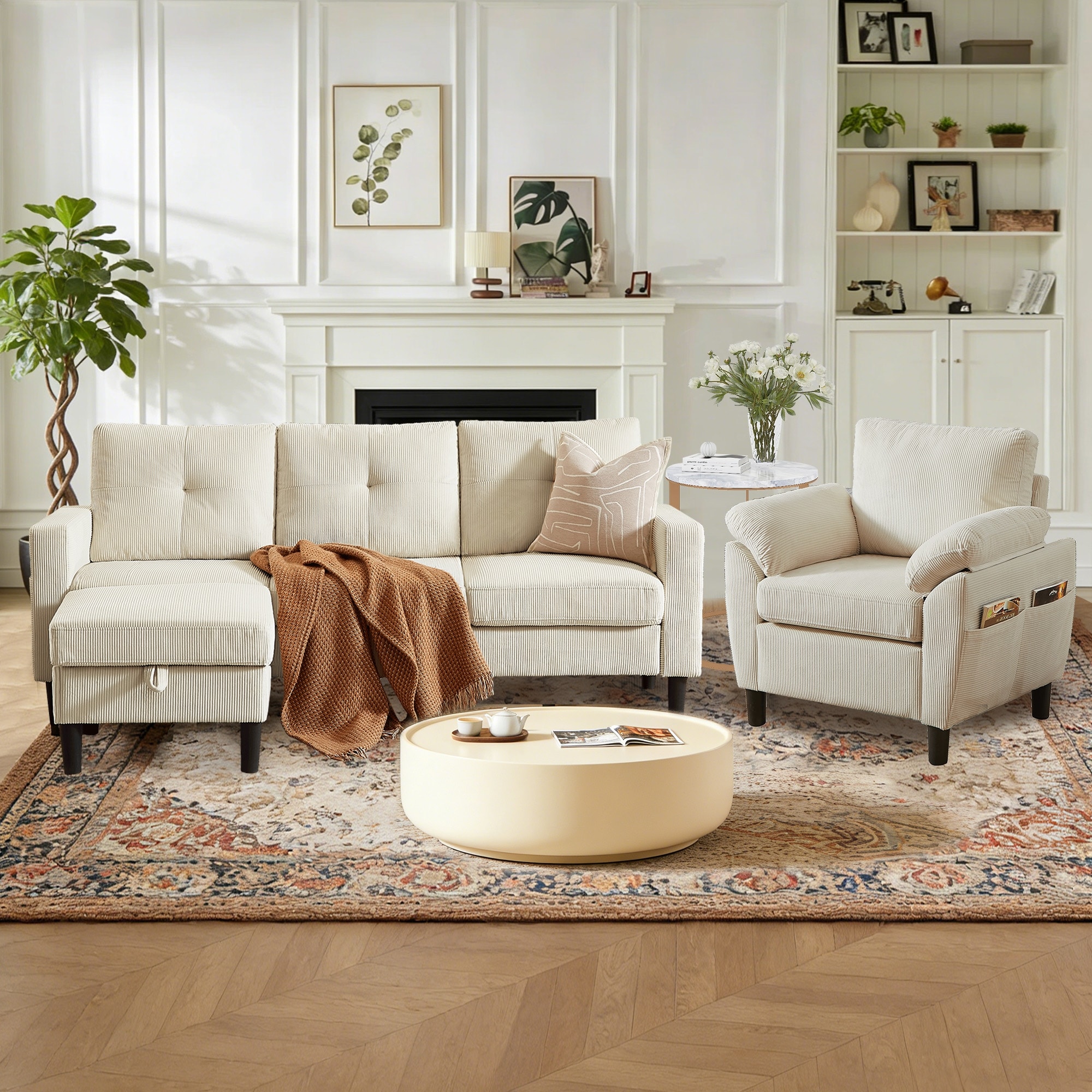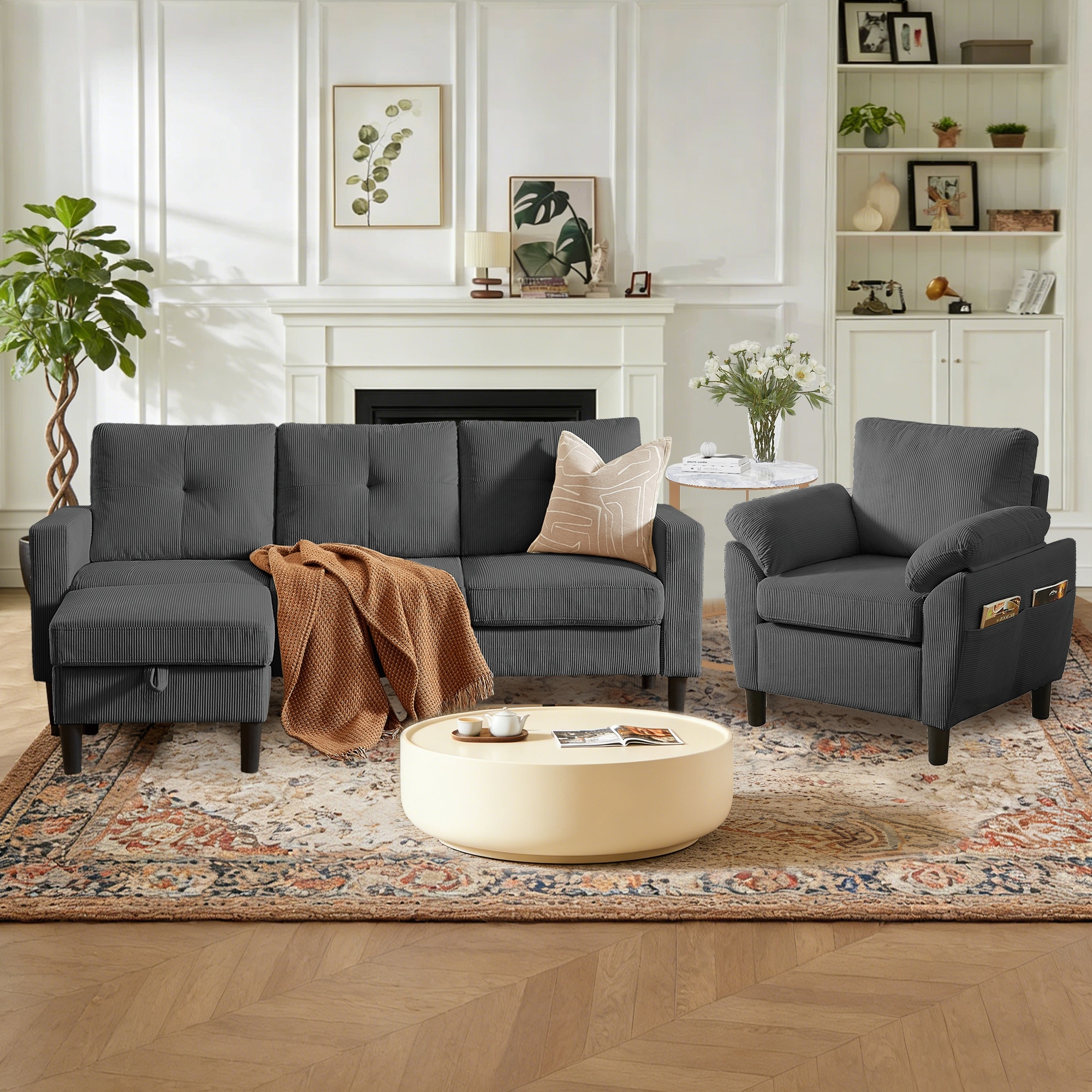 3 Pieces Corduroy Living Room Set with Sofa ,Storage Ottoman and Chair