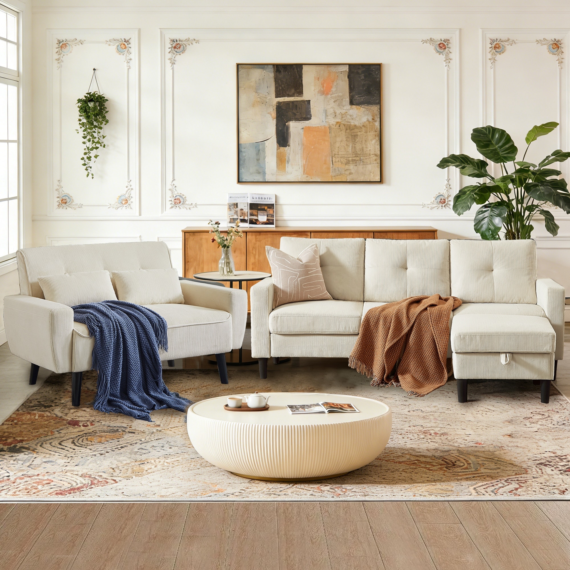 79.14" Corduroy 3 Piece Living Room Set with Sofa,Ottoman and Loveseat