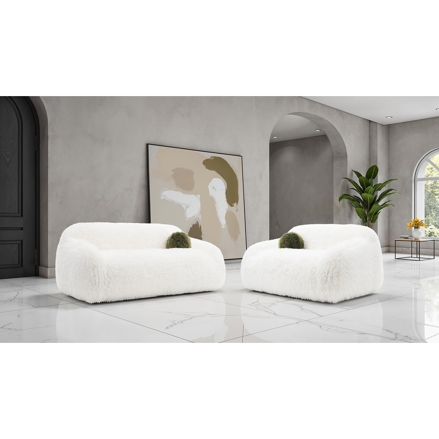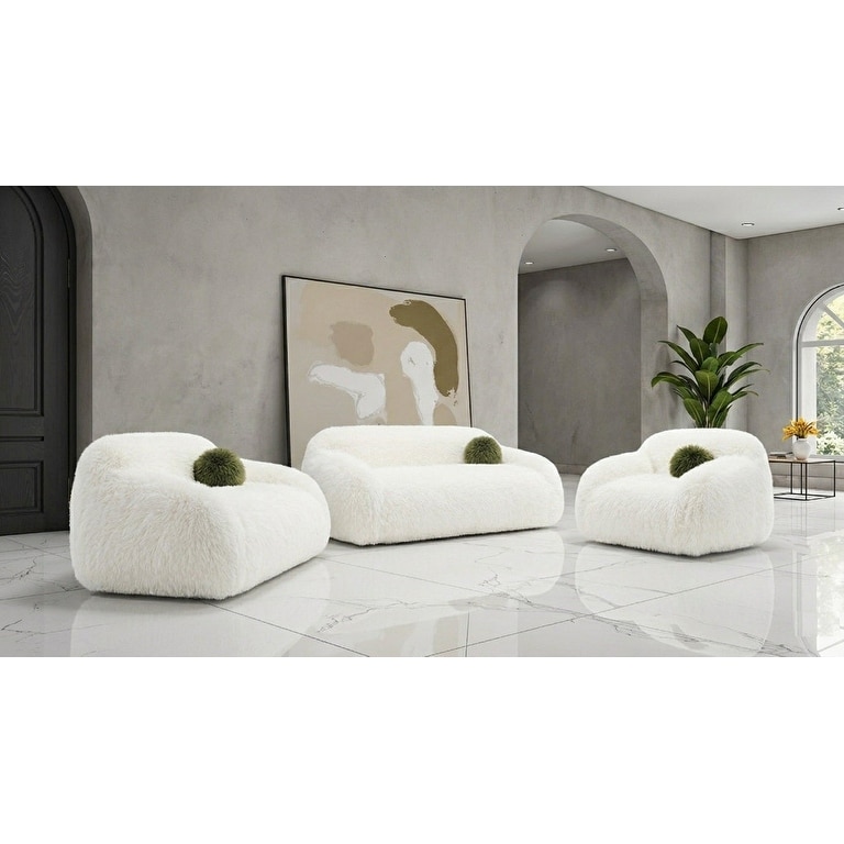 Features:- • Contemporary • White Finish • Long Pile with Plush and Shaggy Texture • Soft and Luxurious to the Touch • Ball Pillows Included • 360-degree Swivel Chair Product Description:- This Contemporary Living Room Set is a statement of modern luxury…