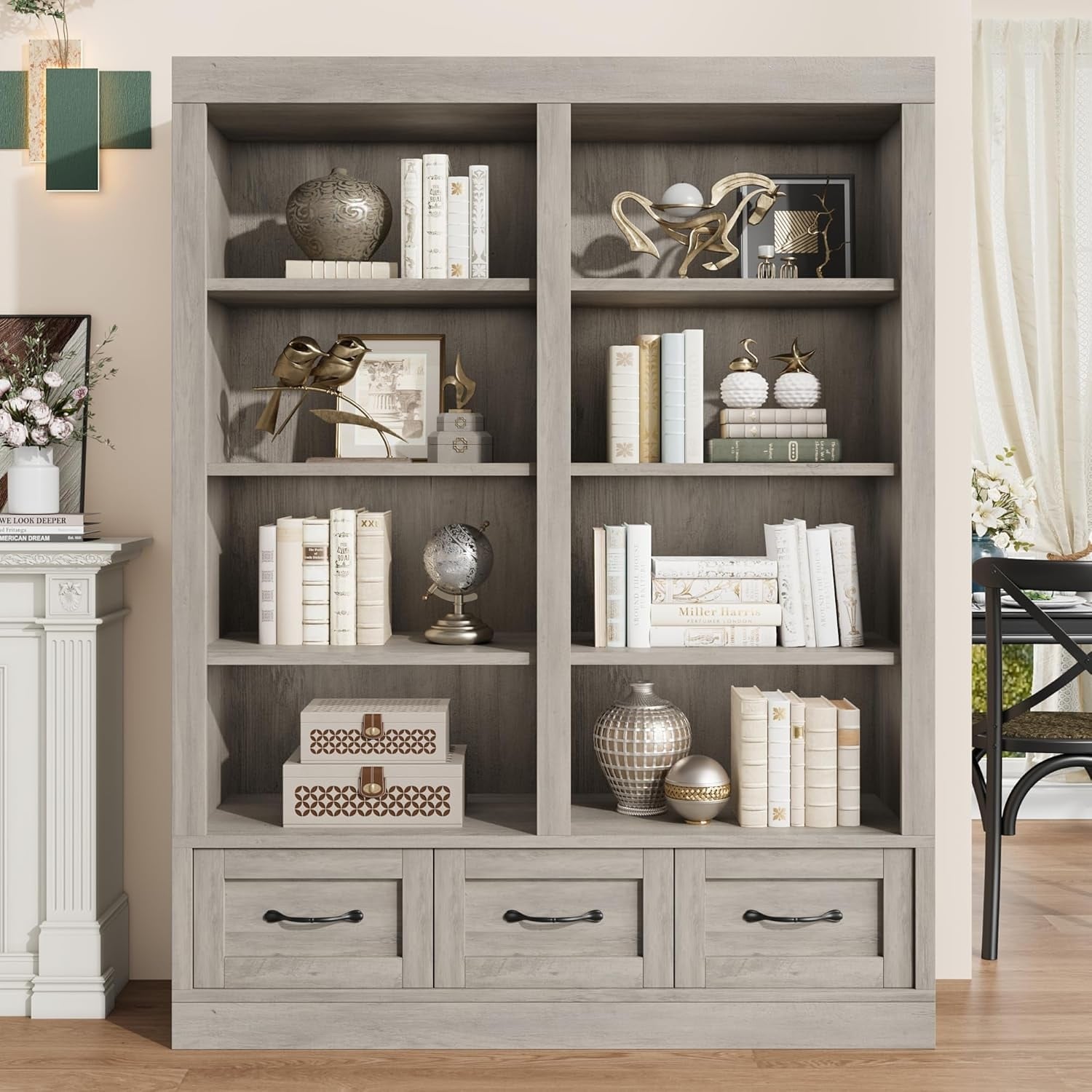 64" H Wooden Tall Bookcshelf with 3 Storage Drawers, Tall Bookcase w/ 4 Tier Double Wide Open Shelf, for Home Office
