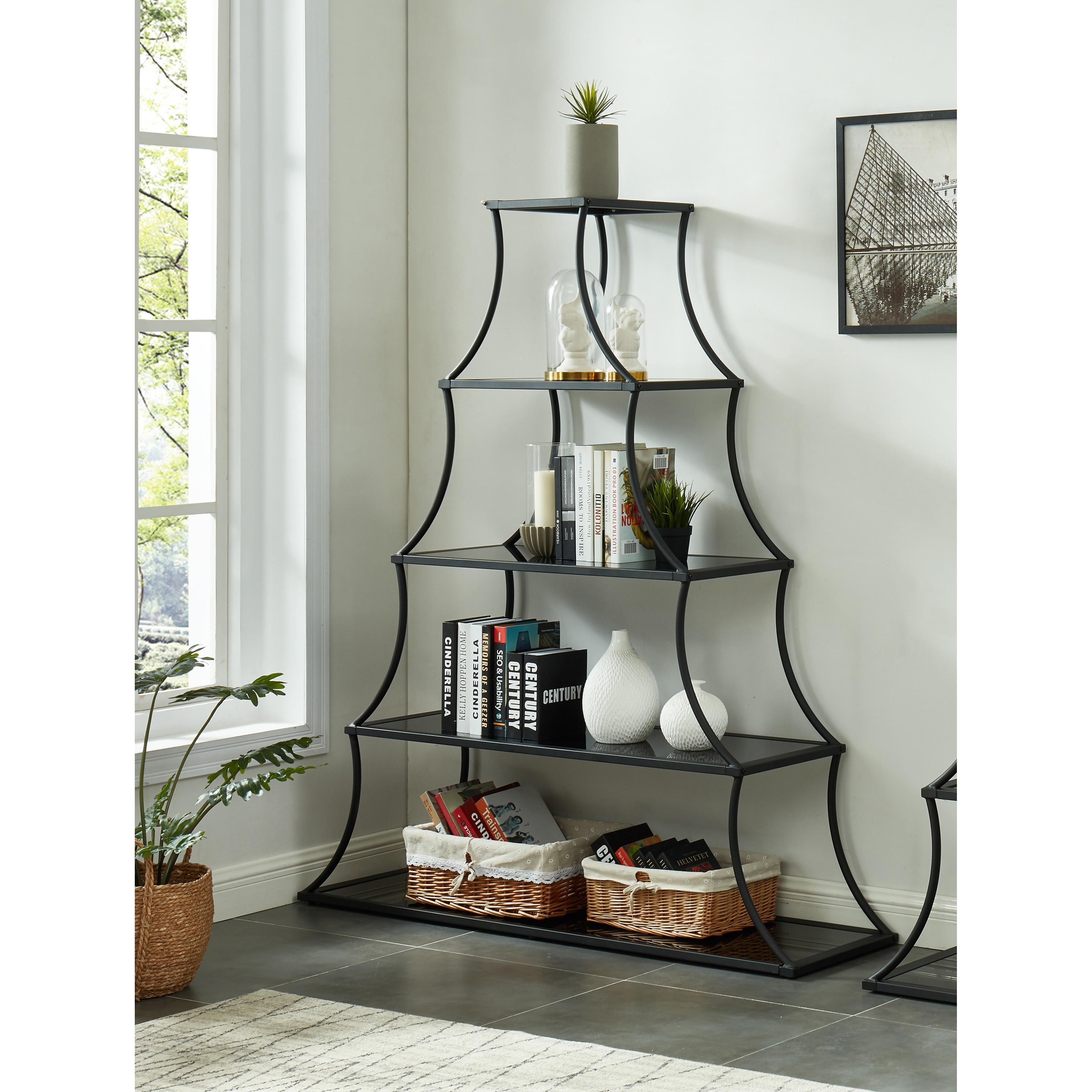 The sand black powder coating metal frame of this ladder bookcase creates a tiered look with tempered glass shelving. Made by Furniture of America, this bookshelf is made from metal and glass.