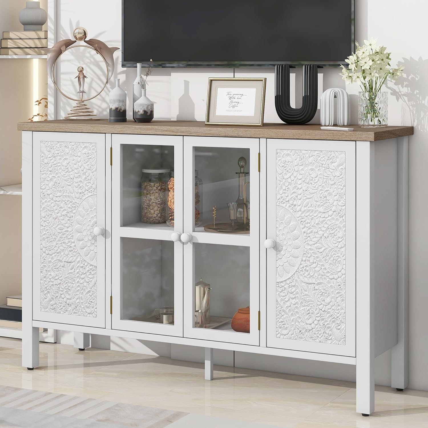 Vintage Wooden TV Stand with Glass Doors & Adjustable Shelf for Living Room, White