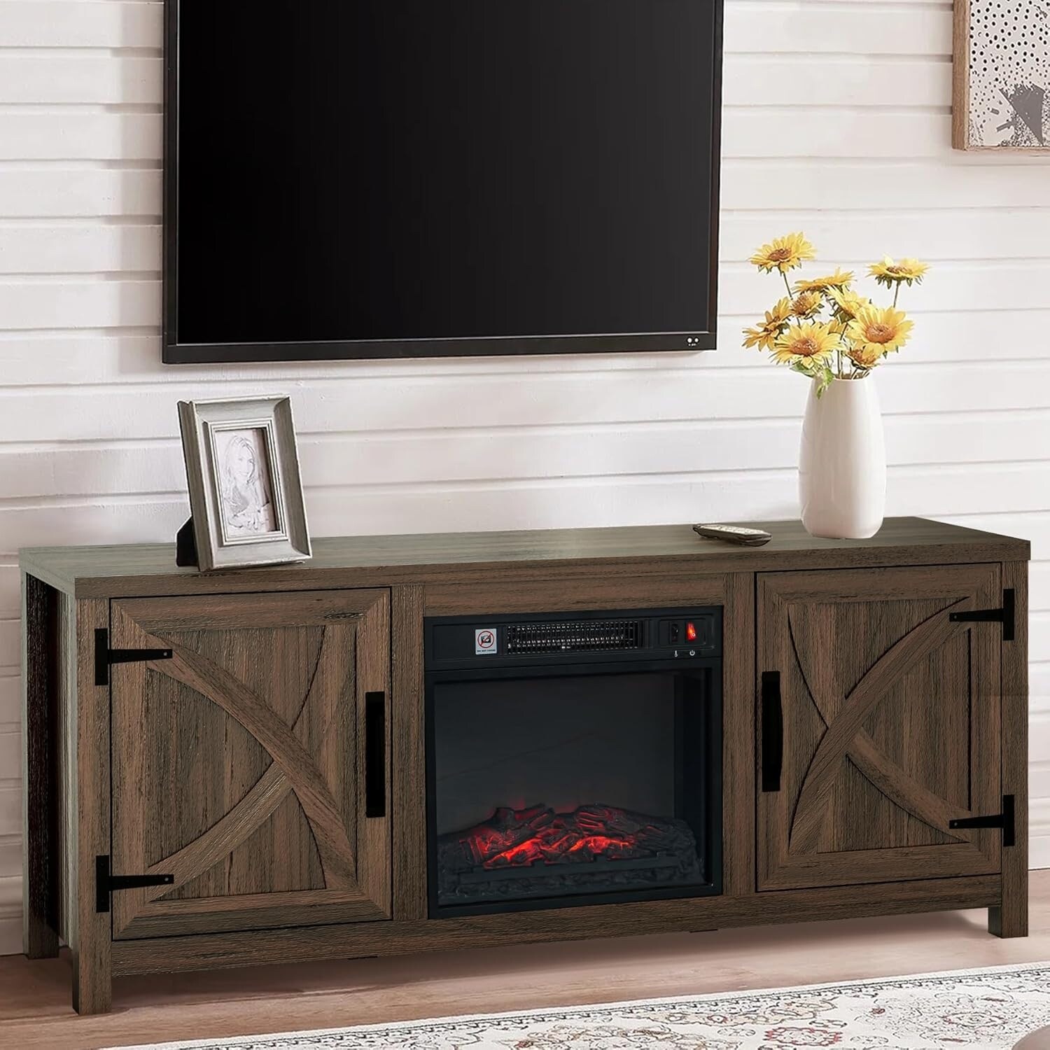 [TRENDY MODERN FARMHOUSE DESIGN] Give your decor a rustic touch with this TV stand that can fit TVs up to 65". Barn doors with X-accents bring a countryside vibe for a stylish update to your interiors.