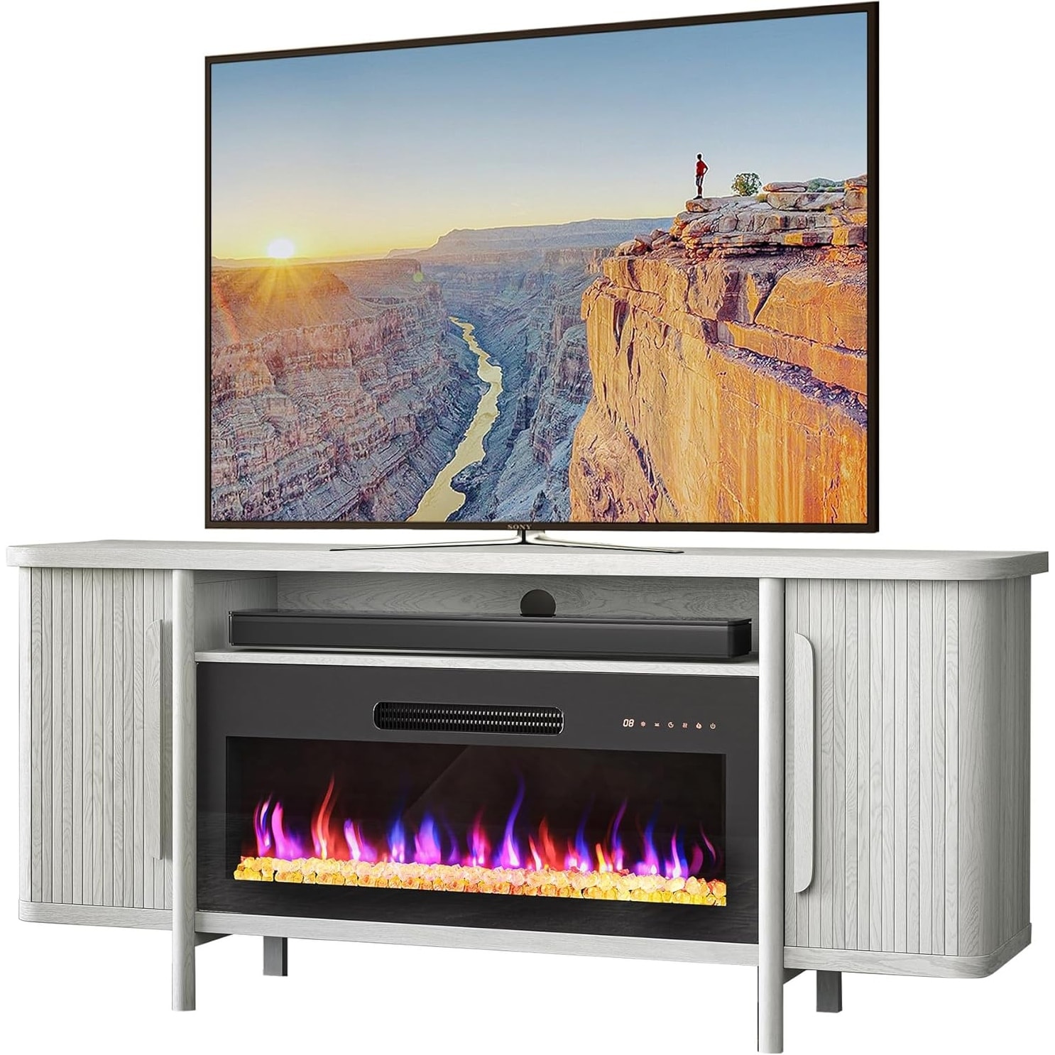 [Ample Storage Space] This fireplace TV stand comes with a middle top open shelf and two side cabinets. Each cabinet contains adjustable shelves giving you ample space to store your media components, books, and collectibles.