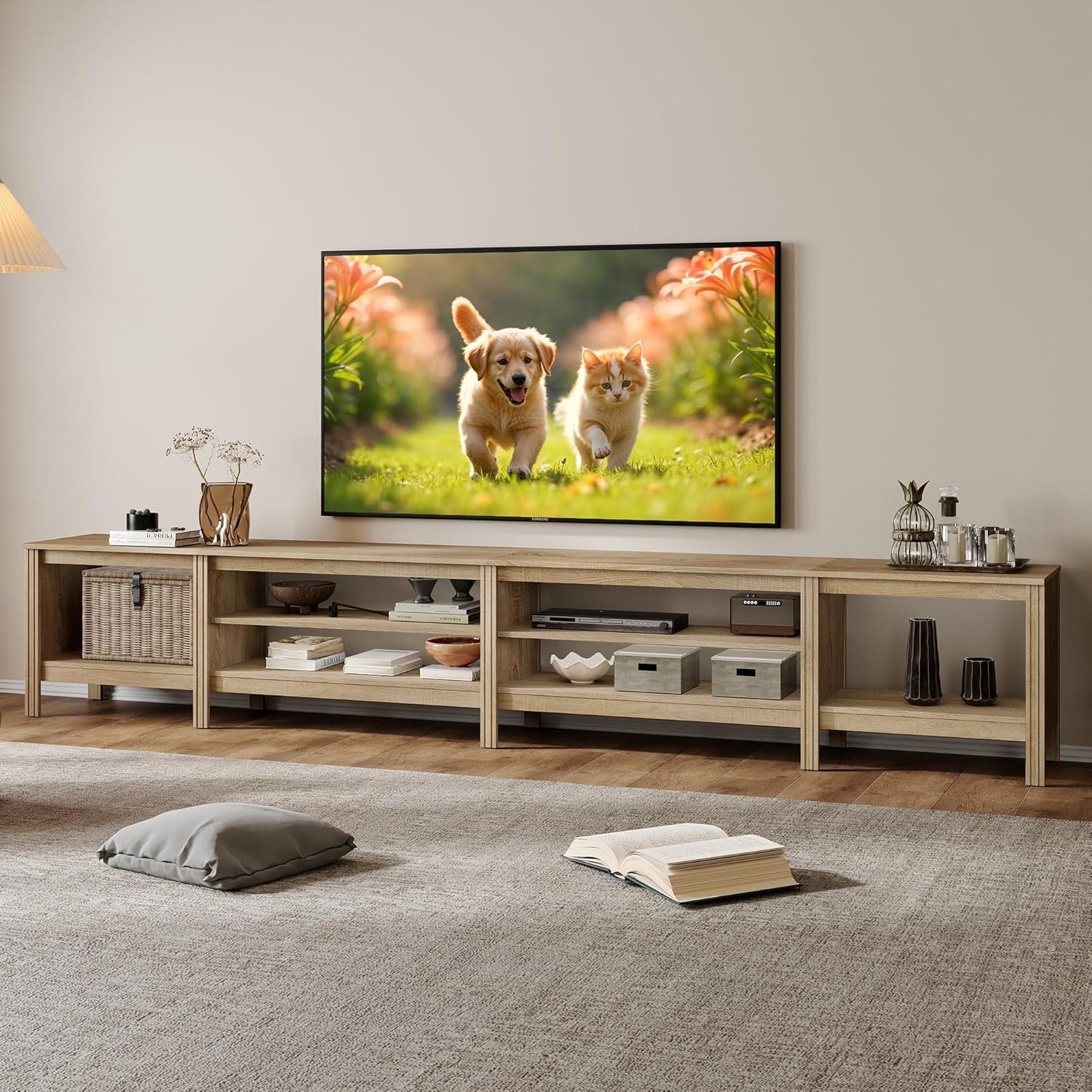 TV Stand for 100" TV, Wood Entertainment Center with 6 Cubby Storage for Living Room Bedroom, Oak