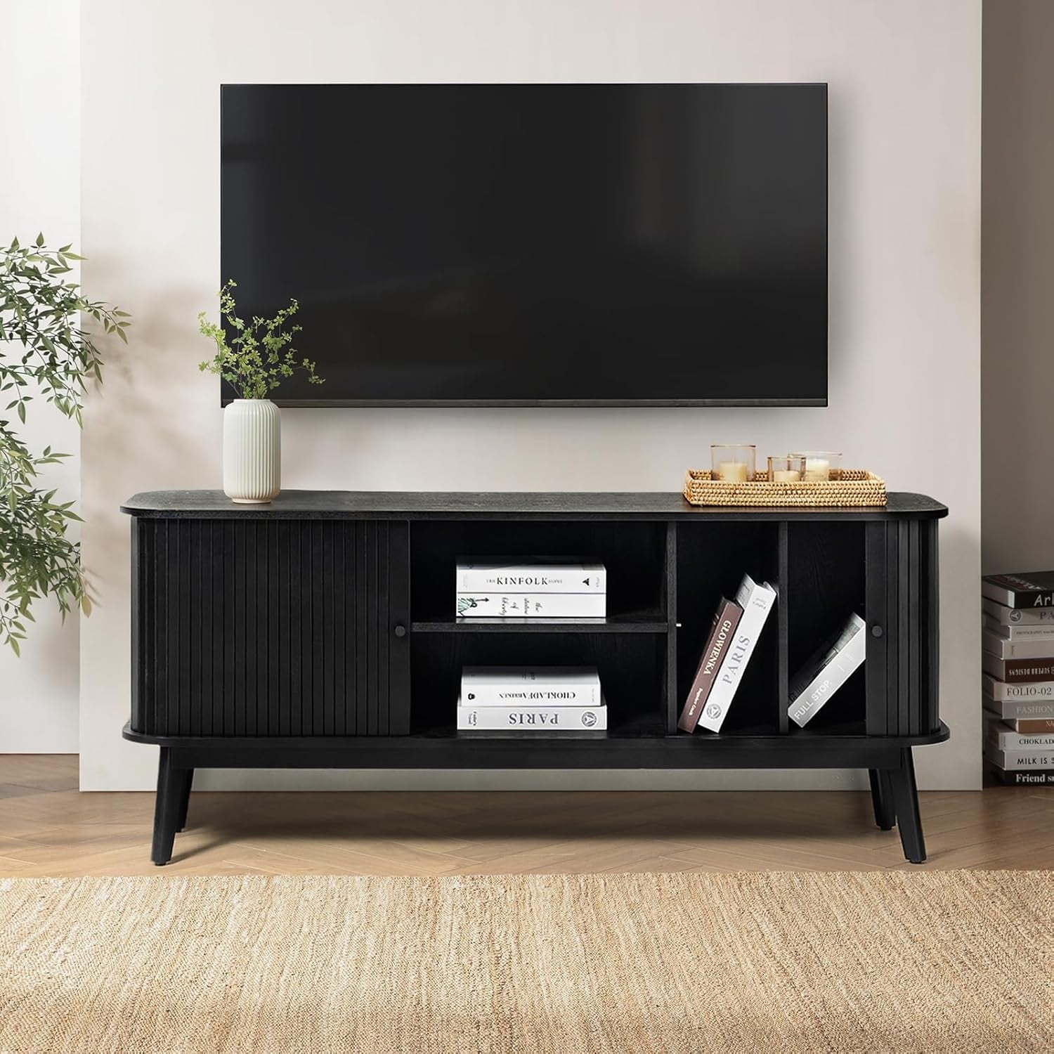 Mid Century TV Stand for 65" with Sliding Barn Doors and Solid Wood Legs, Black