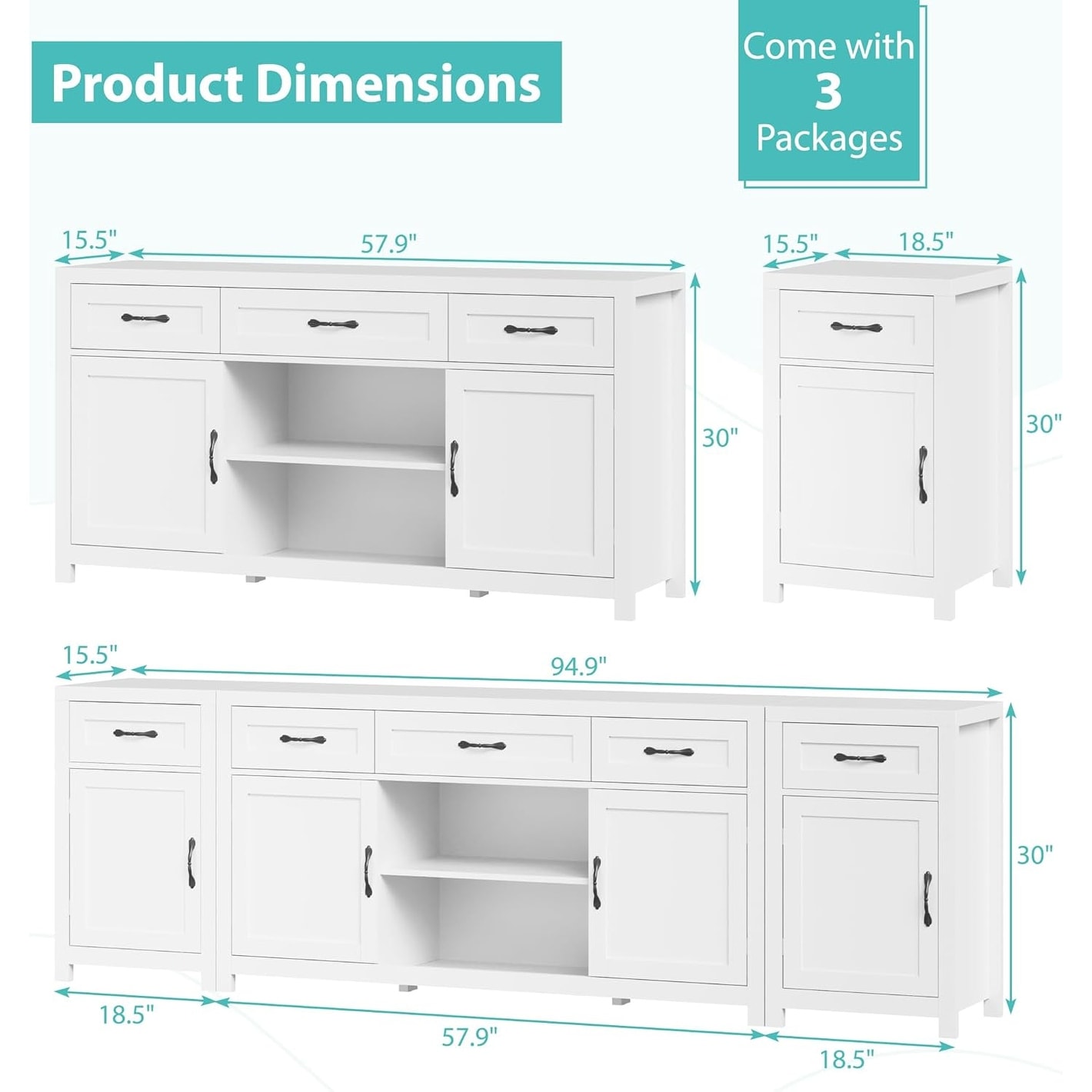 【100 inch long TV Stand Set】The TV cabinet with 2 nightstands has a total length of 100 inches, which can take on different sizes of TVs and also allows you to store more items in your living room and say goodbye to clutter.