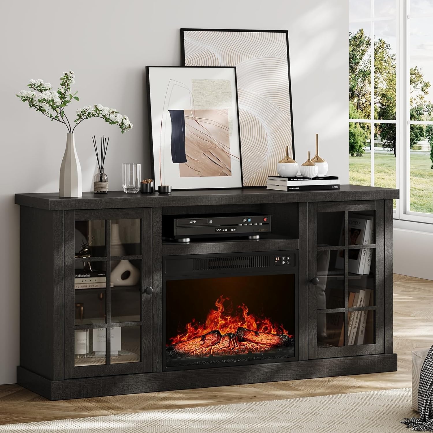 59 Inch TV Stand with 23 Inch Electric Fireplace, Media Console for TVs up to 65 Inches, Storage Cabinet with Glass Doors, Black