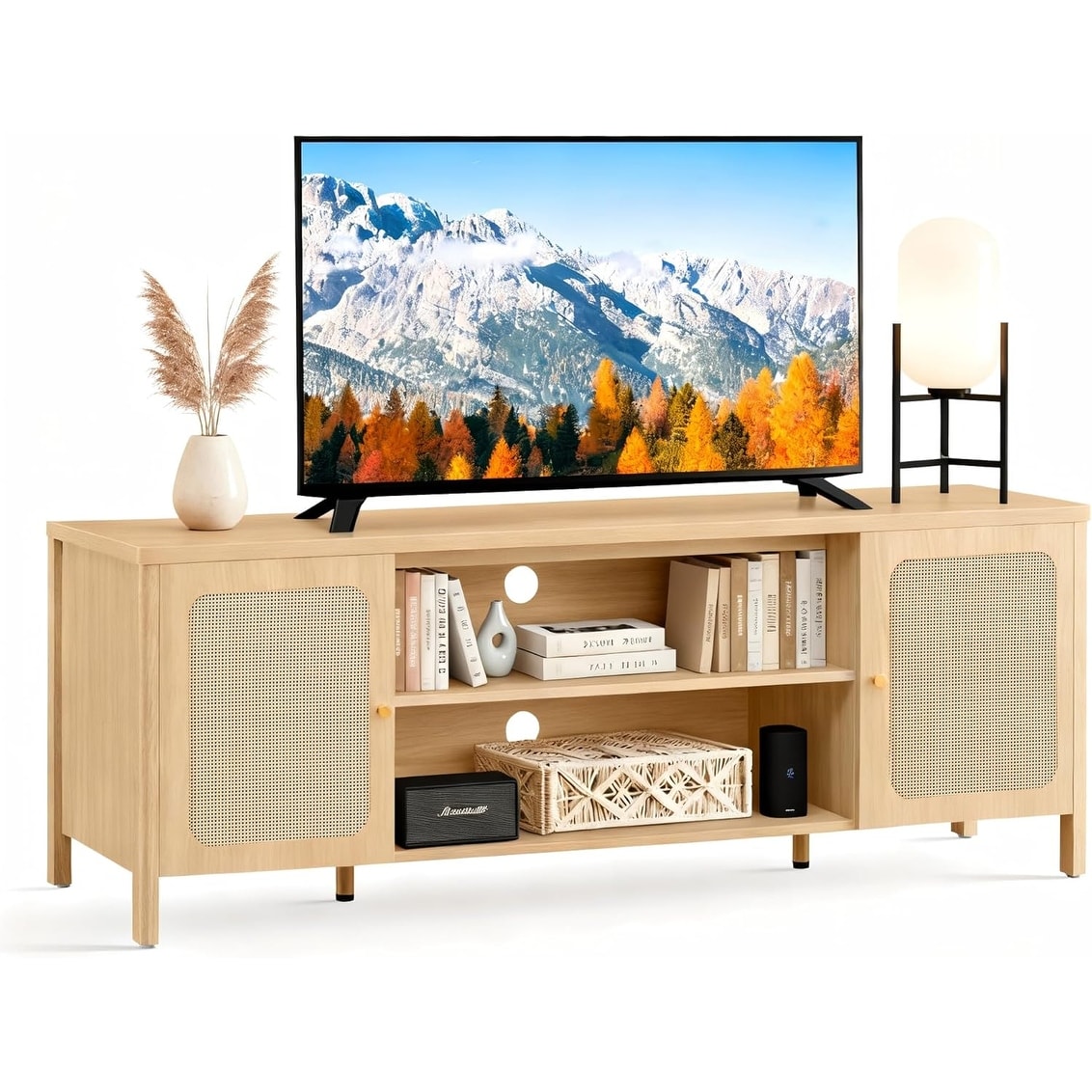 TV Stand for 75'' Screens, Boho Media Console with Adjustable Shelf & 2 Cabinets, Natural Oak