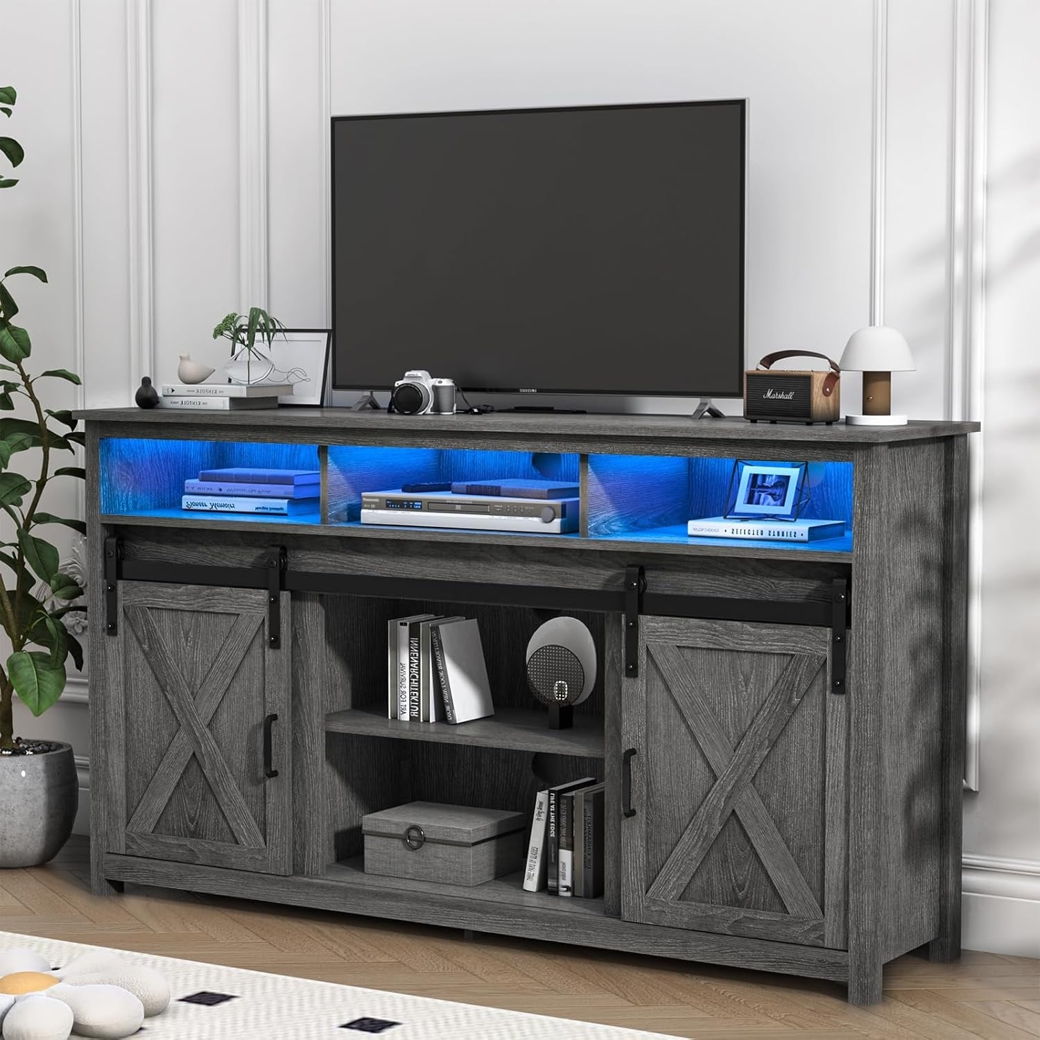 TV Stand for 65 Inch with Power Outlet, Sliding Barn Doors & Storage, Wood Media Console for Living Room, Grey