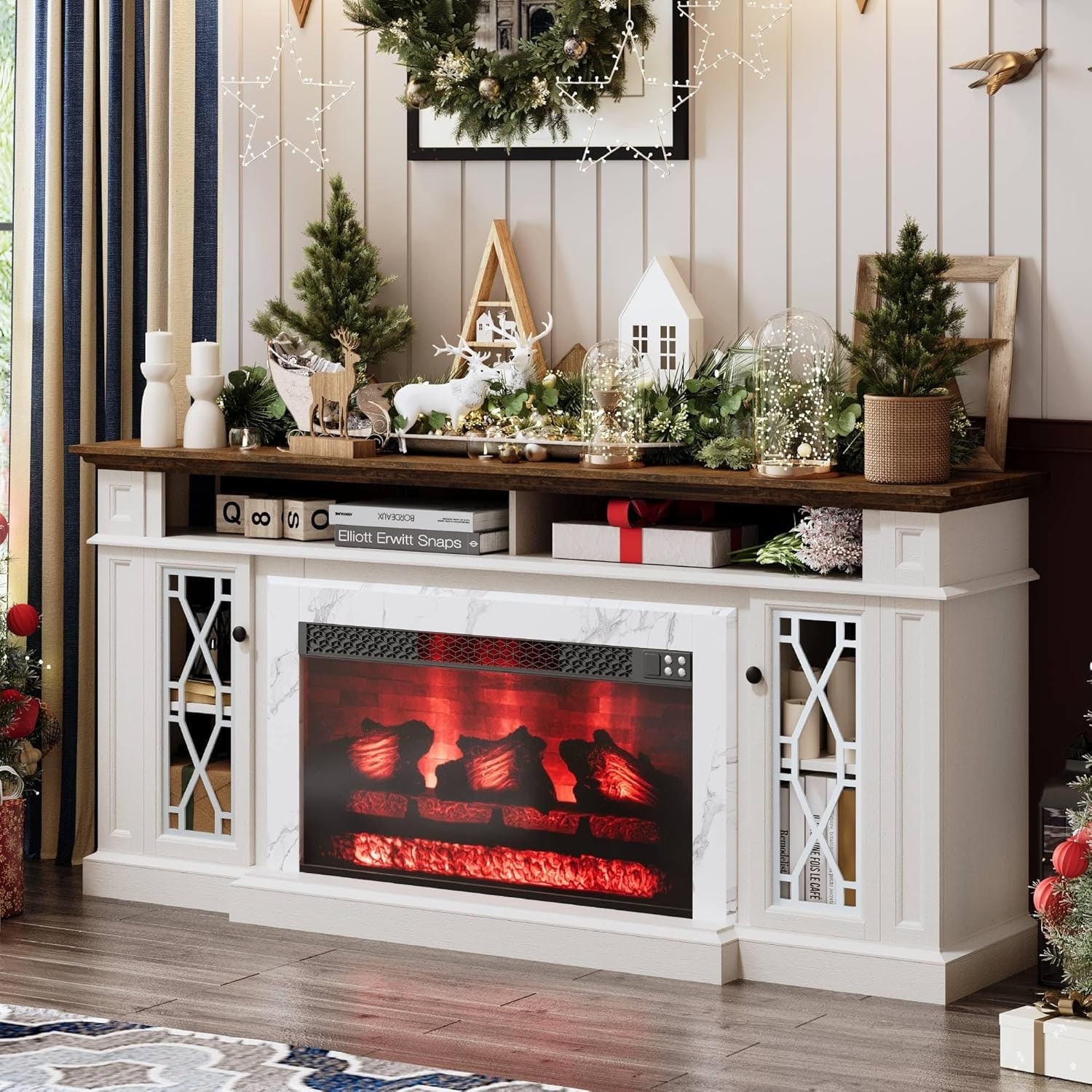 70-Inch Farmhouse Fireplace TV Stand for up to 80-Inch TVs, Entertainment Center with Glass Doors and Adjustable Shelves, White