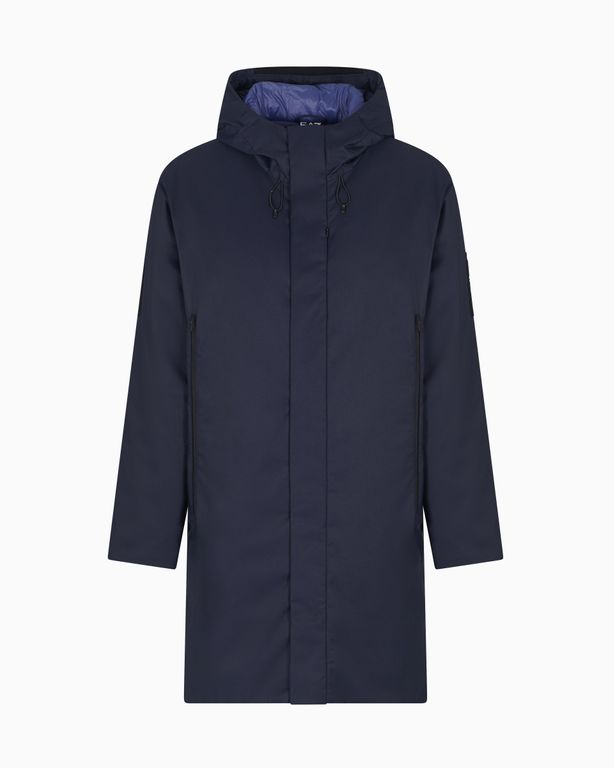 Men's EA7 Asv Padded Hooded Parka - Blue - Parka jackets Padded parka with clean lines, made of recycled technical fabric. Featuring a hood, zip fastening and zipped pockets, this garment is designed to complete casual everyday looks: perfect with...