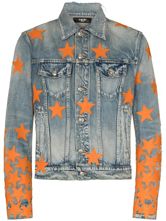 Men's Amiri Chemist Star Trucker Clay Denim Jackets - Blue - Leather jackets Orange/faded indigo cotton blend embroidered stars motif classic collar front button fastening two chest flap pockets two side welt pockets long sleeves buttoned cuffs...