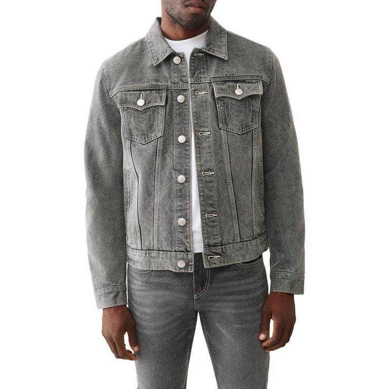 Men's True Religion Jesse Trucker Jacket - Gray - Casual jackets A grey wash gives an understated update to a staple trucker jacket made from nonstretch cotton denim for a crisp fit with every wear. 26 3/4" length Front button closure Spread collar...