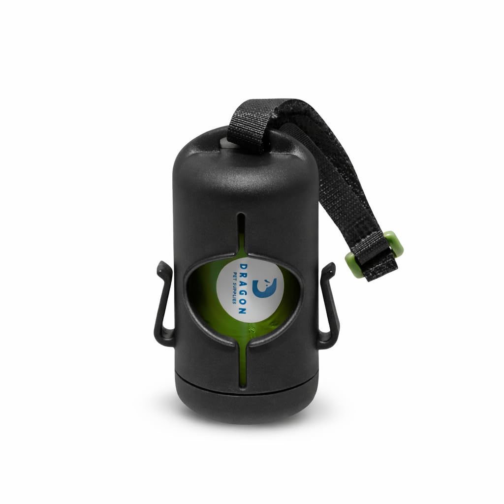 DRAGON Waste Bags Durable Dispenser, Dog poop bags holder with Two Hooks on the side for Used Poop Bags, leash attachment strap and 15 Poop Bags (