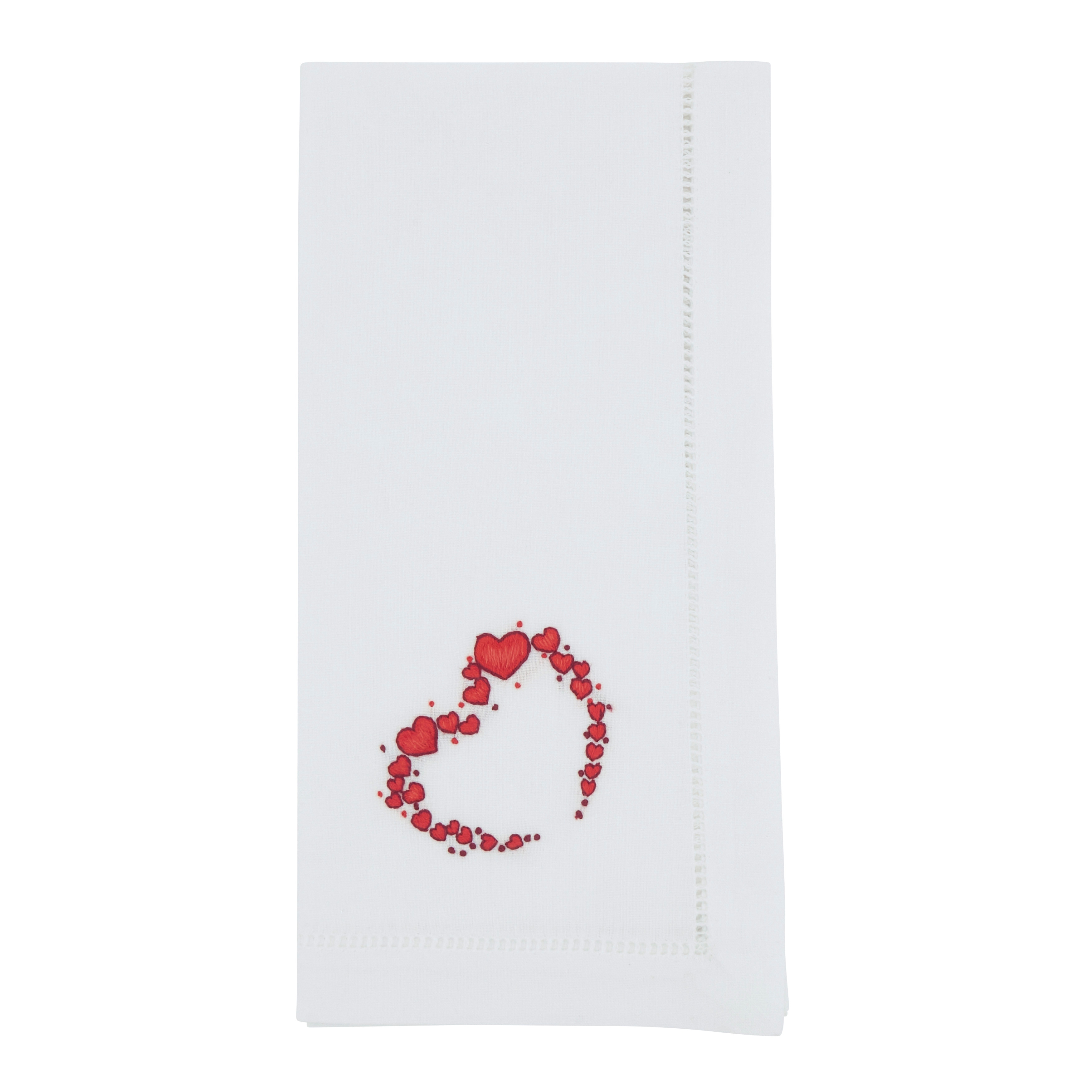 Embroidered Heart Wreath Cotton Napkins (Set of 6) - Scattered Heart Circle Motif with Hemstitch Border, 20"x20"