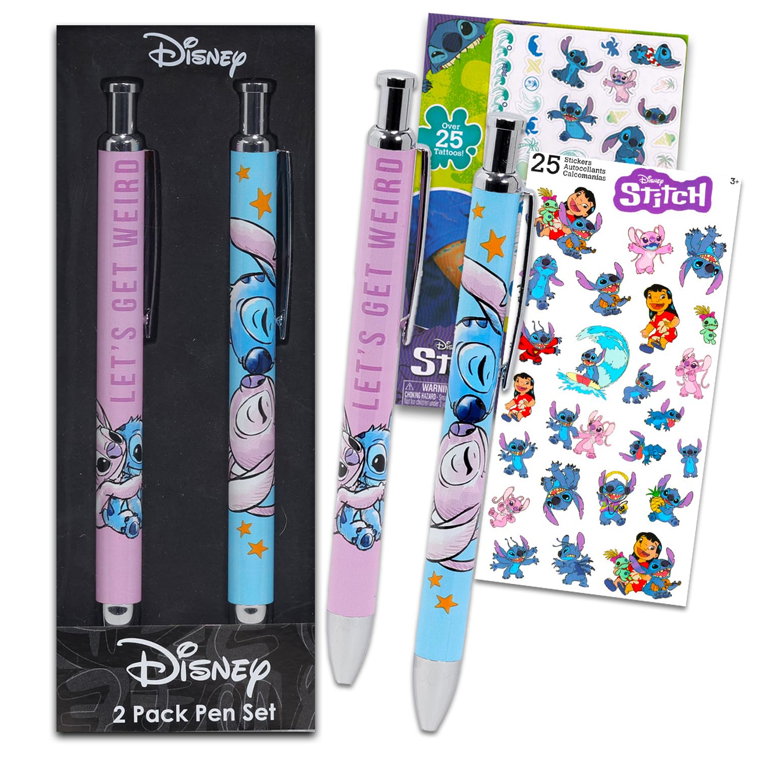 Disney Stitch Pens Set - Bundle with 2 Stitch and Angel Pens with Clip Plus Stickers, Tattoos for Stocking Stuffers Lilo and Stitch Stationery Gift