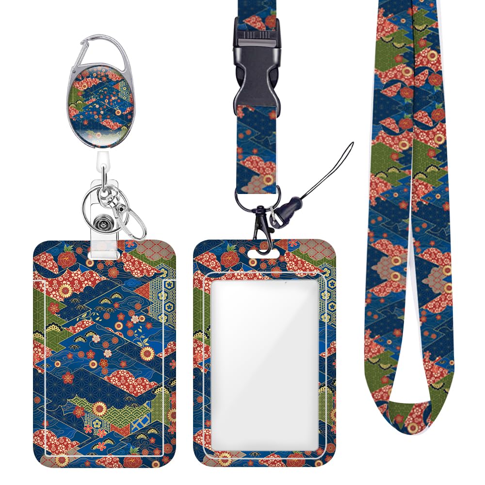 Japanese Floral Patchwork ID Badge Holder Badge Reel Lanyards for ID Badges Work Vertical Protector Retractable Carabiner Clips Heavy Duty Key Lanyard