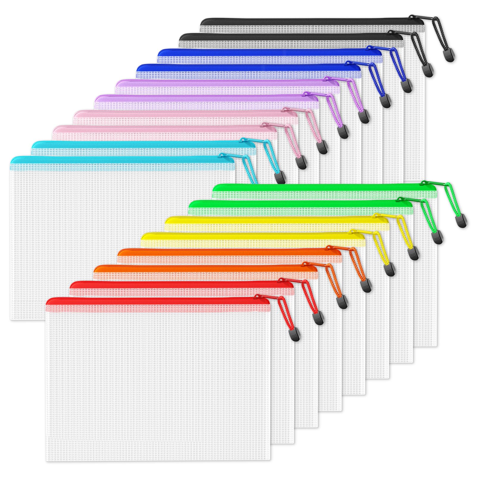 SUNEE Plastic Mesh Zipper Pouch 10x14 in (9 Colors, 18 Packs),Extra Large Water-Resistant Zip Bag for School Office Supplies, Puzzles & Games