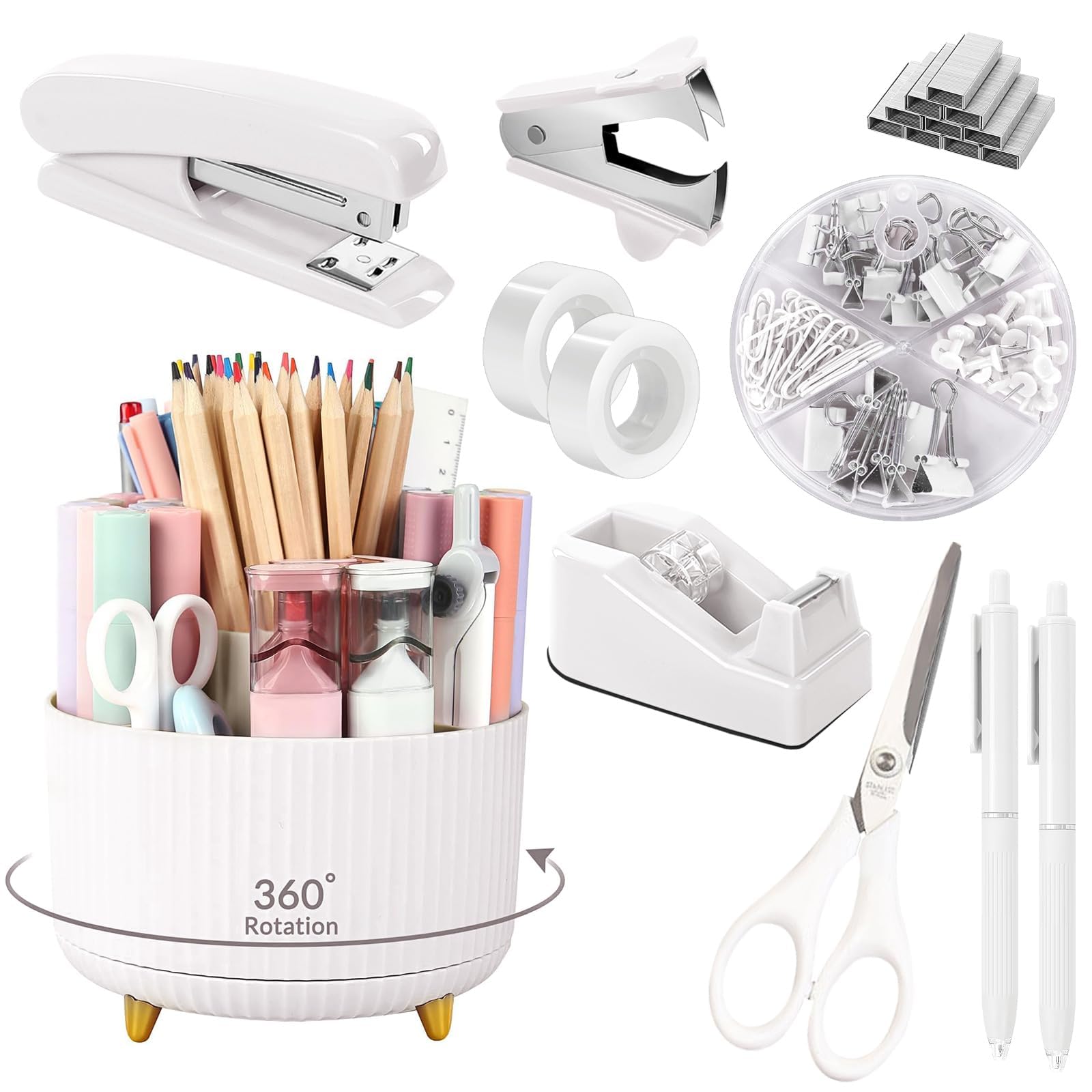Desk Organizers and Accessories Set:White Office Supplies set includes a variety of essential office items,1 x 360-degree rotating pen holders, 1 x staplers, 1 x staple removers, 1000 x staples, 1 x scissors,1 x rulers,1 x tape dispenser, binder clips & paper clips & push pins kit, 2 x tapes.This ri