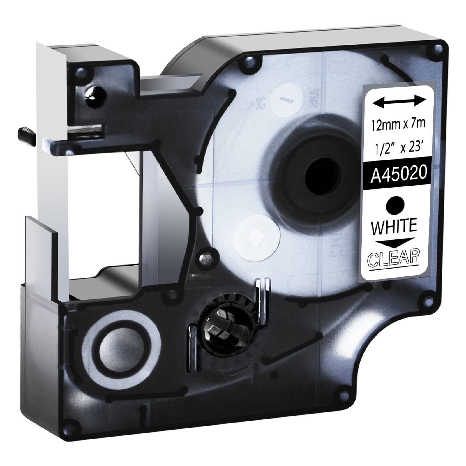 PACKAGE INCLUDES: 1 Pack replacement for Dymo 45020 S0720600 transparent Label tape. Color: White Text Print on Clear Background. Length: 7m(23ft) x Width:12mm(1/2") Quick to USe: Compatible for Dymo D1 label cartridge refills feature an easy to peel split-back tape. It can be safely removed without