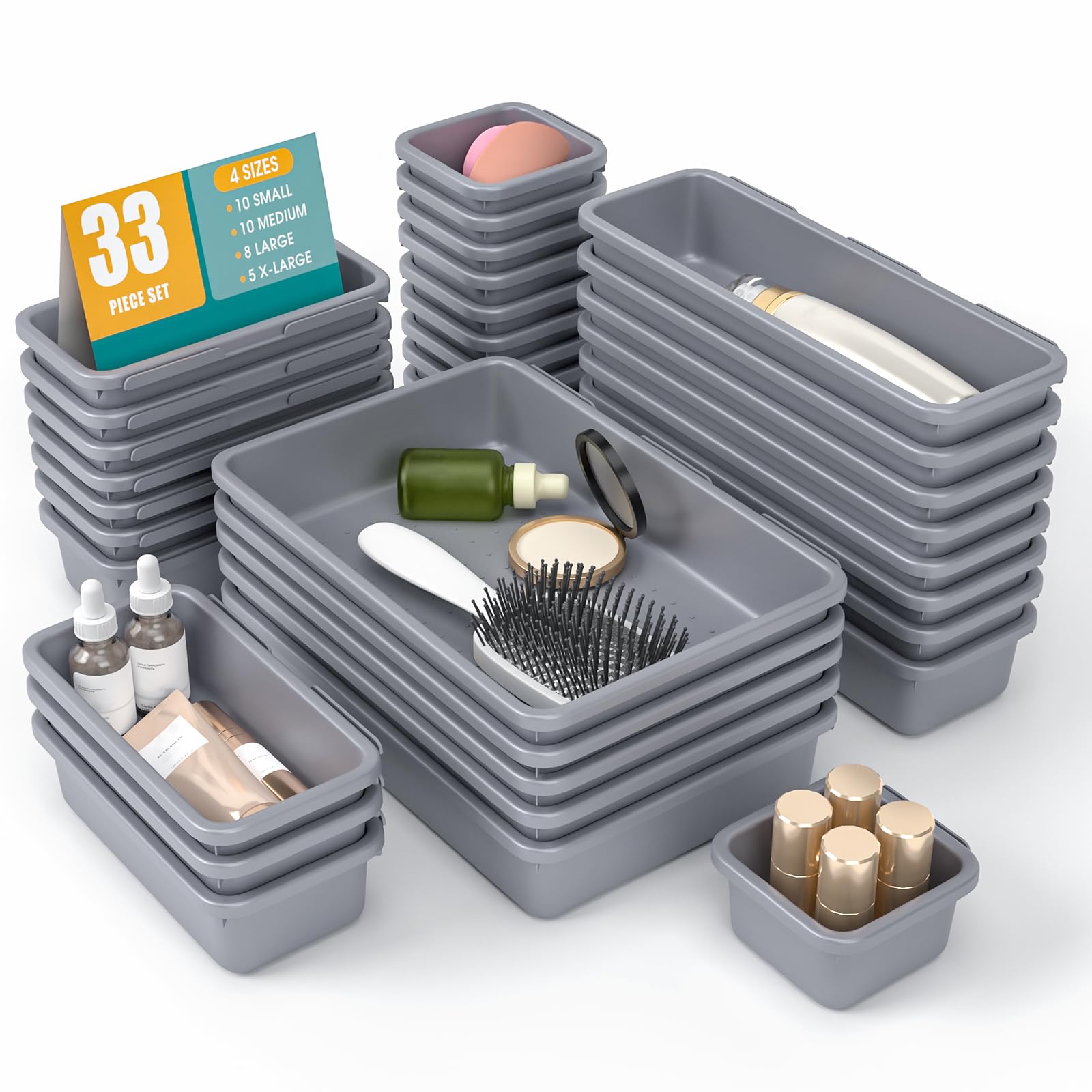 33 PCS Drawer Organizer Set, 4 Size Makeup Drawer Divider Organizer With Non-Slip Pads, Interlocking Plastic Storage Bins for Office,Jewelry Vanity,