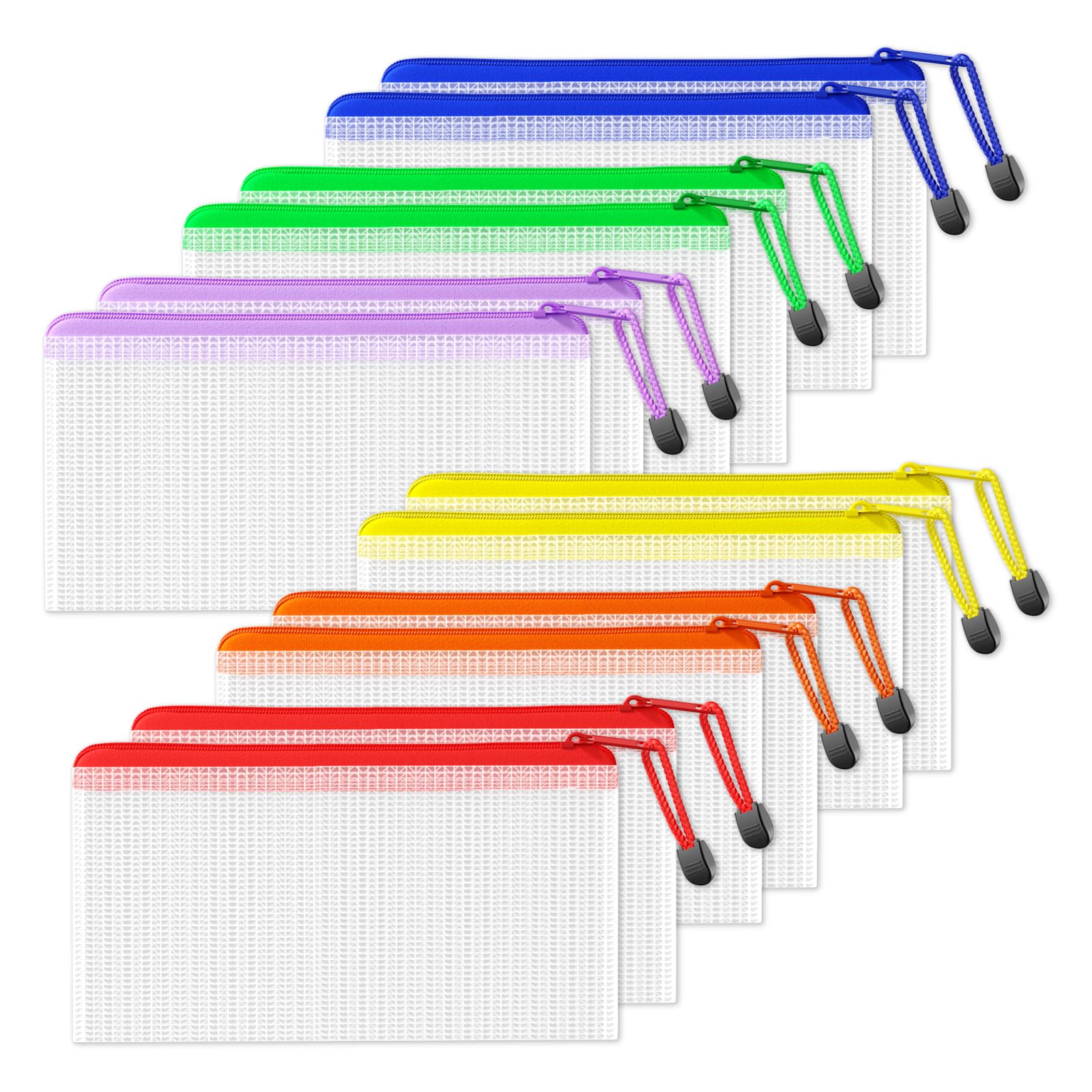 SUNEE Plastic Mesh Zipper Pouch 4.6x9.2 in (6 Colors, 12 Packs), Small Water-Resistant Zip Bag for School Office Supplies, Pencil Organizing Storage