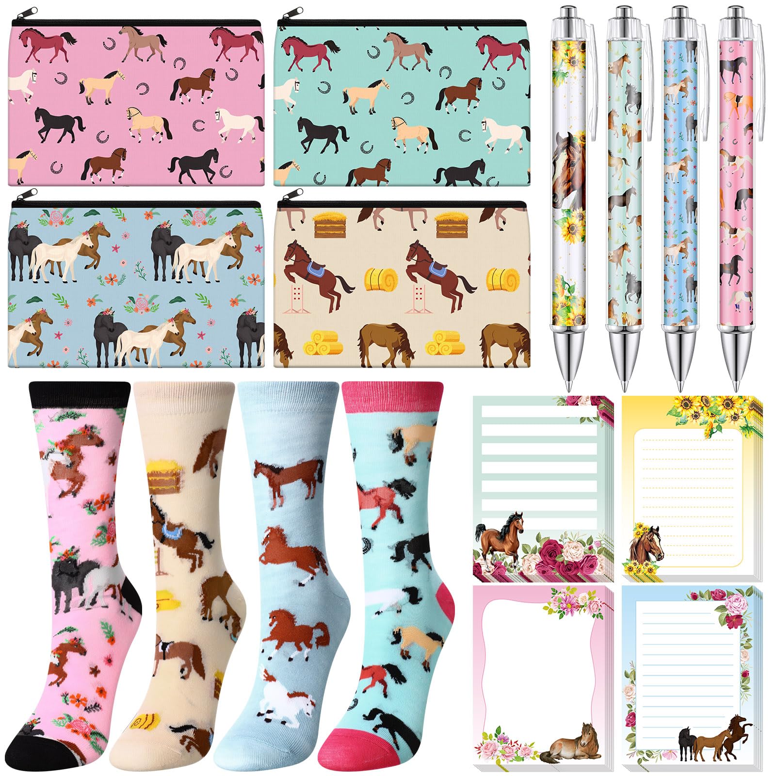 Horse Office Supplies: the package contains 4 pieces horse sticky notepads, 4 pieces horse pens, 4 pieces horse cosmetic bags and 4 pairs horse socks; With nice combinations and enough quantity, can meet your various demands or replacements, making it easy to stay organized and show off your love fo