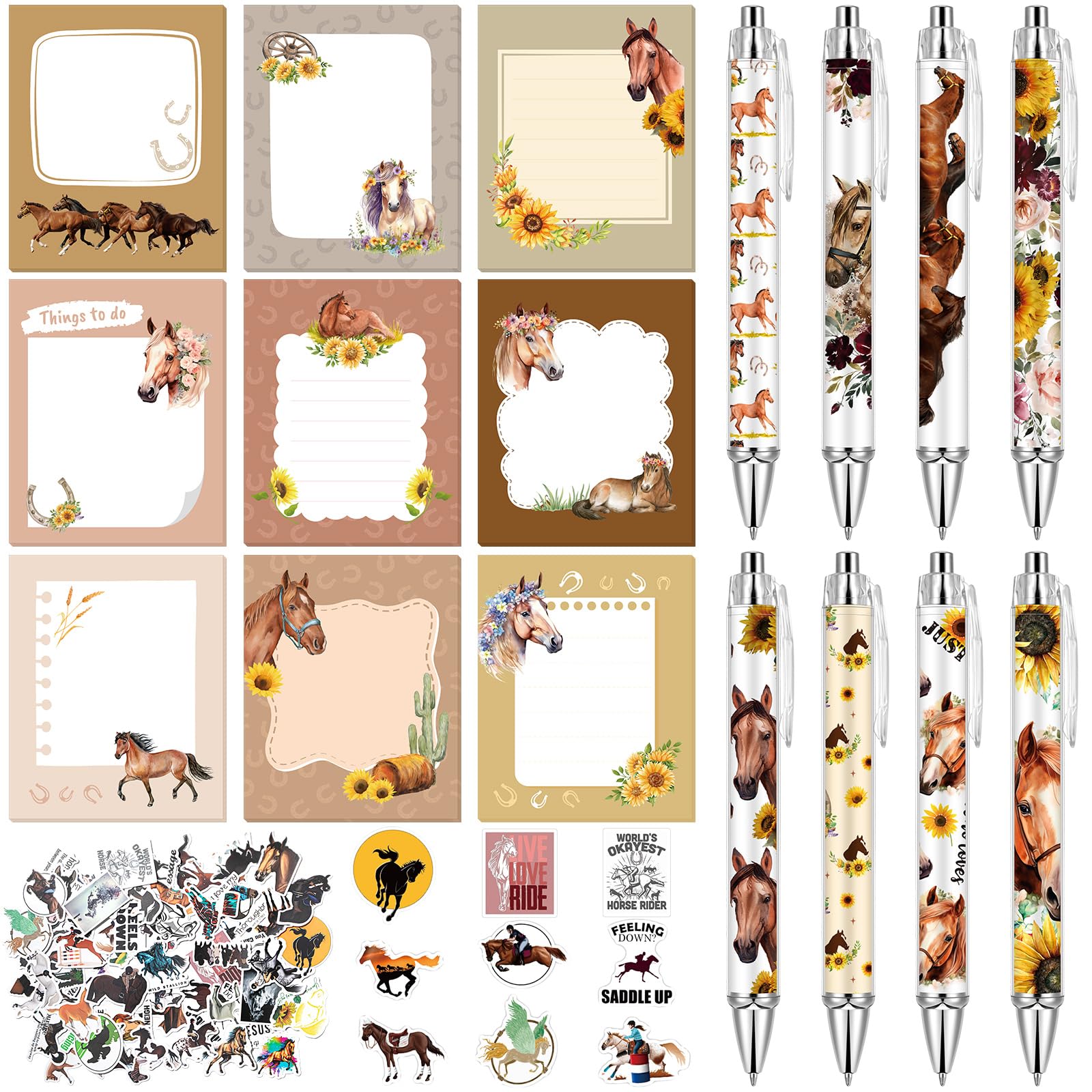 Substantial and Engaging Horse Themed Set: revel in the charm of this Horse gifts set that includes 9 Horse sticky notes (50 sheets per each), 8 horse ballpoint pens, and 1 pack horse stickers (about 50–60 sheets); To meet your daily needs or to share with friends and colleagues, this rich quantit