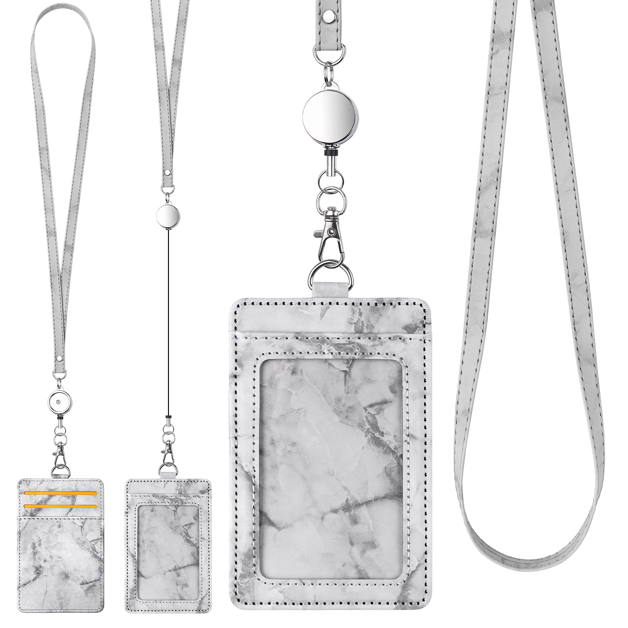 ID Badge Holder with Lanyard Marble Pattern Retractable Badge Holder PU Leather with Clear ID Window 1 Credit Card Case Name Badge Keychain Tags