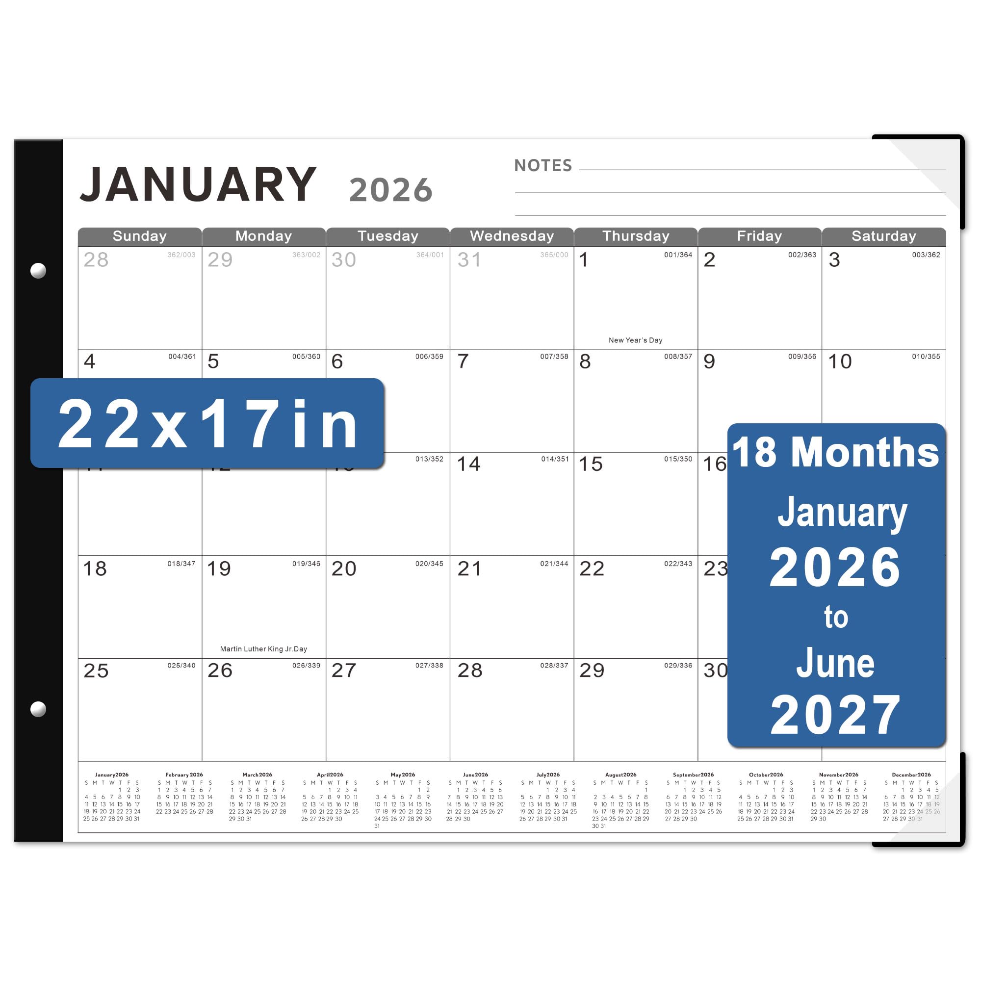 Calendar 2026, 18 Mouths from January 2026 to December 2026. The size of large desk calendar is 22" x 17" 2026 desk calendar large 22x17 have large ruled blocks every month, measure 3” L x 2.4” W, providing enough space for your schedule records and helping you make better daily and monthly long
