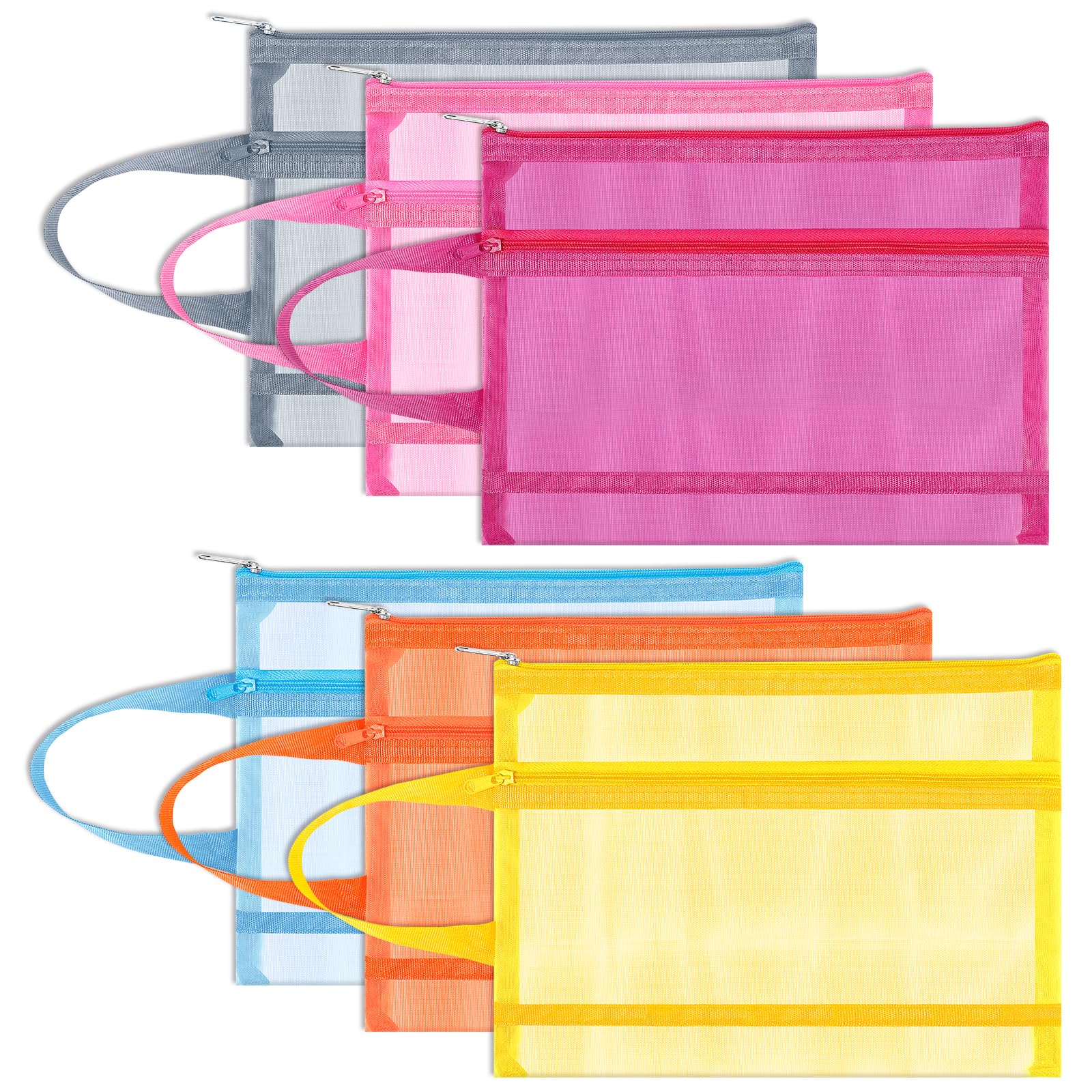 Fassave 6 Pack Mesh Zipper Pouch Bags, Double Layer Nylon Pouch with Handle for Office Travel Organization (Multicolor, A5)