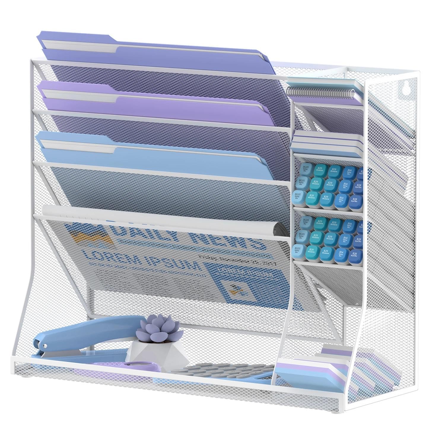 JMHUD Wall File Organizer, 5-Tier Desk Organizer with 4 Pen Slots, Hanging Wall File Folder Holder with R-shaped Bottom Tray, Mesh Versatile Mail