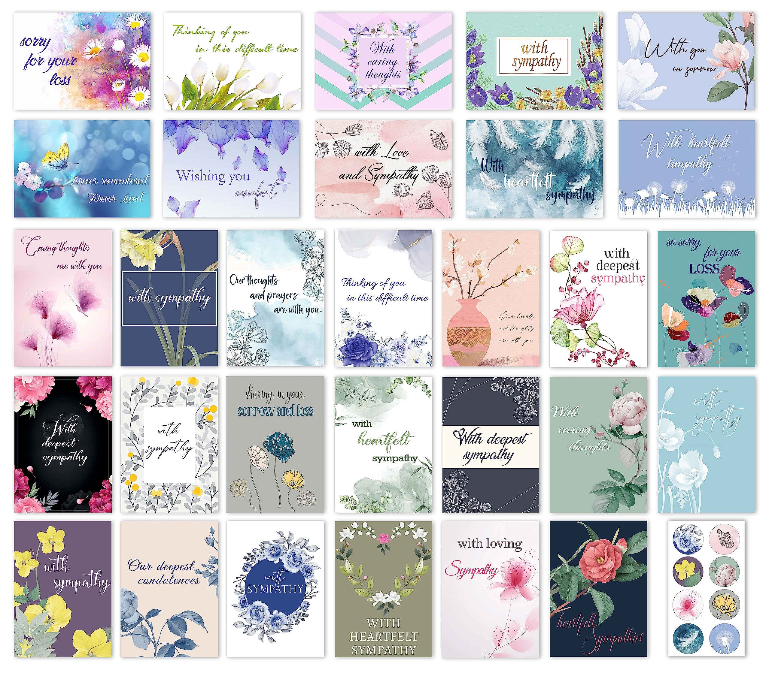 Title: Sympathy Cards with Envelopes and Stickers, 30 Unique Designs with Messages Inside, Large 5x7 Inch Folded Condolence Cards, Thick Cardstock in a. Product Type: Office Products > Office & School Supplies > Paper > Cards & Card Stock > Greeting Cards