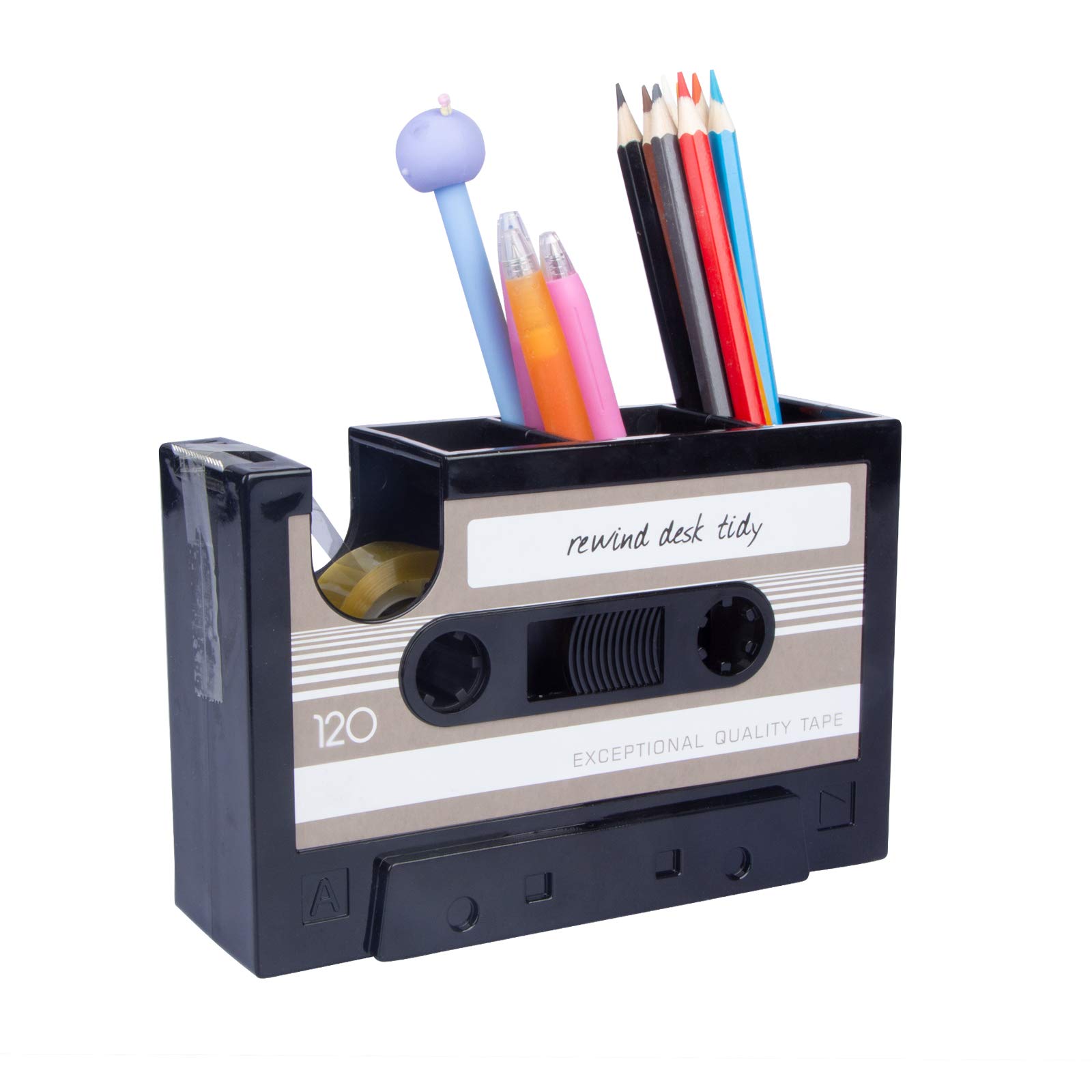 【Retro Cassette Tape Design】This retro cassette tape design makes this pen holder really eyecatching, it's not just a pen holder, but also a tape dispenser 【Premium Material】This pen holder is mainly made of ABS plastic, which is safe, also stainless steel tape dispenser can help us to cut t