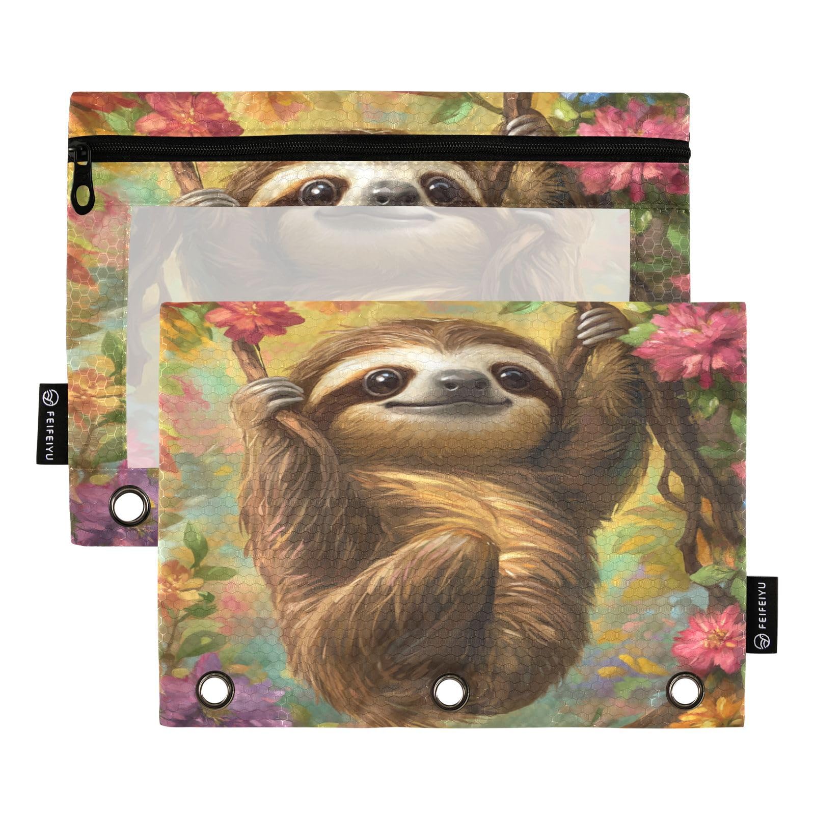 Cute Baby Sloth Pink Flower 3 Ring Pencil Pouch, Binder Pencil Pouch with Zipper and Clear Window, 2 Packs
