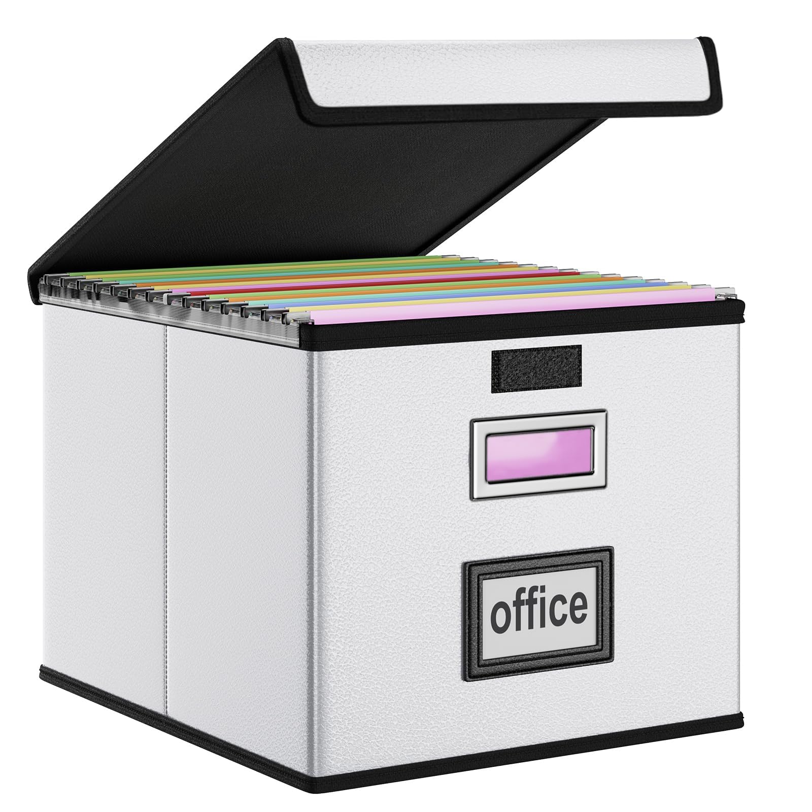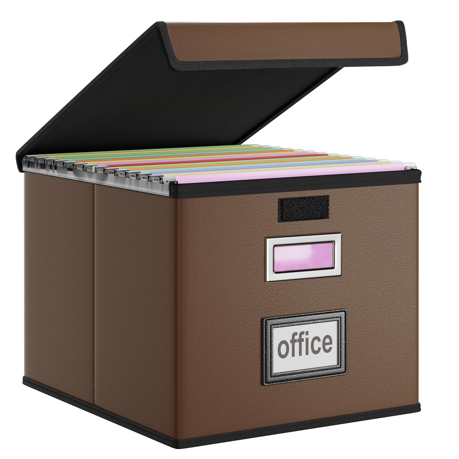 Huolewa Faux Leather File Organizer Box with Lid, Collapsible Hanging File Folder Box Organizer with Plastic Slides, Decorative Home/Office Filing