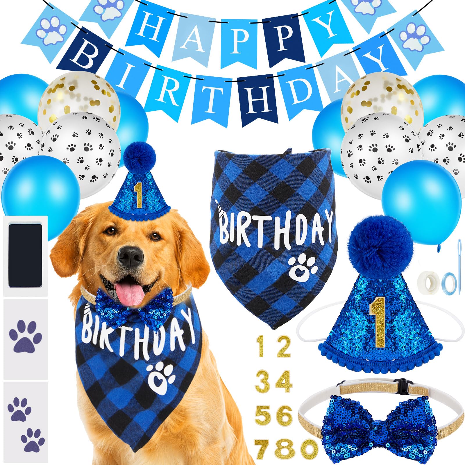 Dog birthday supplies: the package contains 1 piece dog birthday bandana, 1 piece dog birthday hat with 0-8 Figures, 1 piece birthday banner, 6 piece latex balloons, 4 pieces pawprint balloons and 2 pieces confetti balloons, as well as 1 piece touch ink pad and 2 piece imprint cards, a thoughtful gi