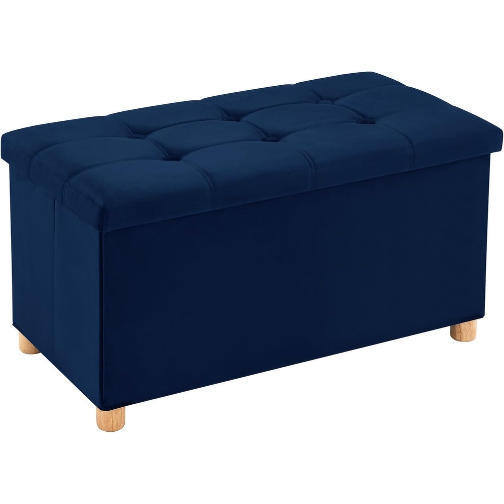 Folding Storage Ottoman Bench, Velvet Chest with Wooden Legs, 350lbs Capacity for Bedroom or Living Room, Navy Blue