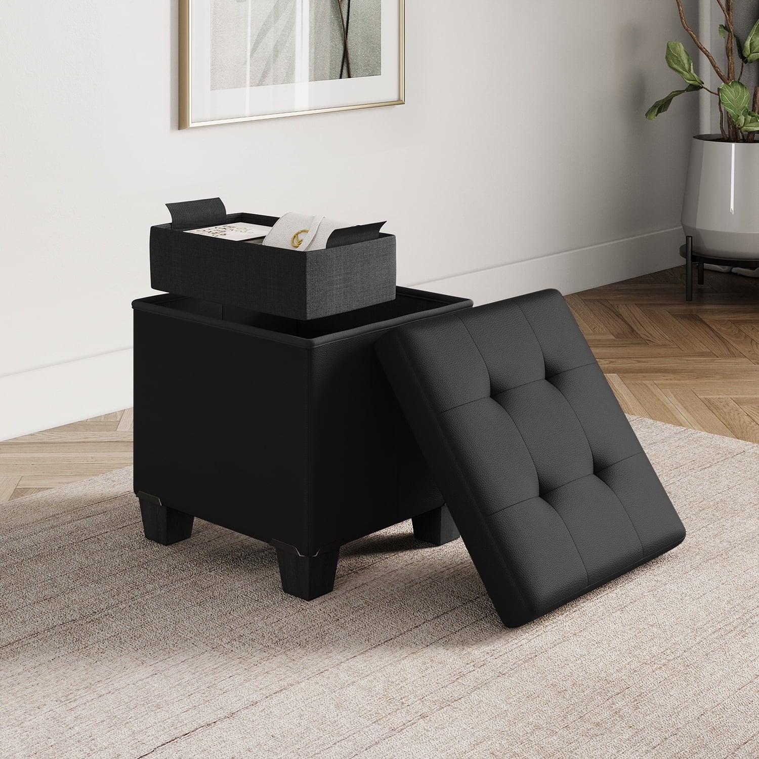 15-inch Faux Leather Storage Ottoman Bench with Removable Bins, Foldable Footrest Stool for Living Room